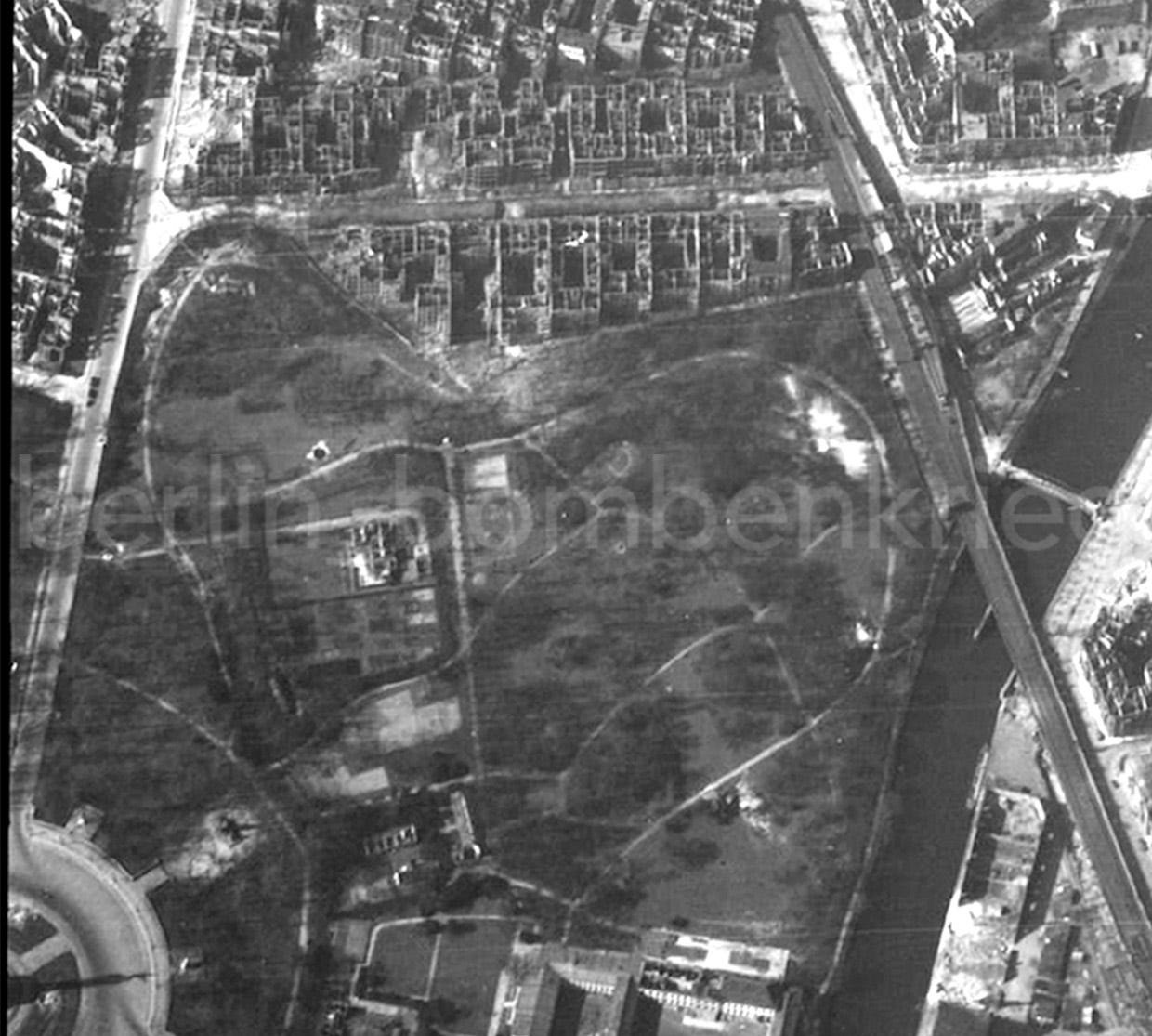 First question to aboard is to know in which zone these structures were built. Original photo captions and brief information available until today just reported as being in the “Tiergarten section”, a very large and vast area of the German capital. It is well known that Berlin’s largest green zone was used during the last months of the war as an improvised landing strip with several oral testimonies and reports about transport aircraft’s attempts to land here (and as a drop zone for container dropping) but none of them mentioned an aircraft depot or hangar-style structure like these ones.
