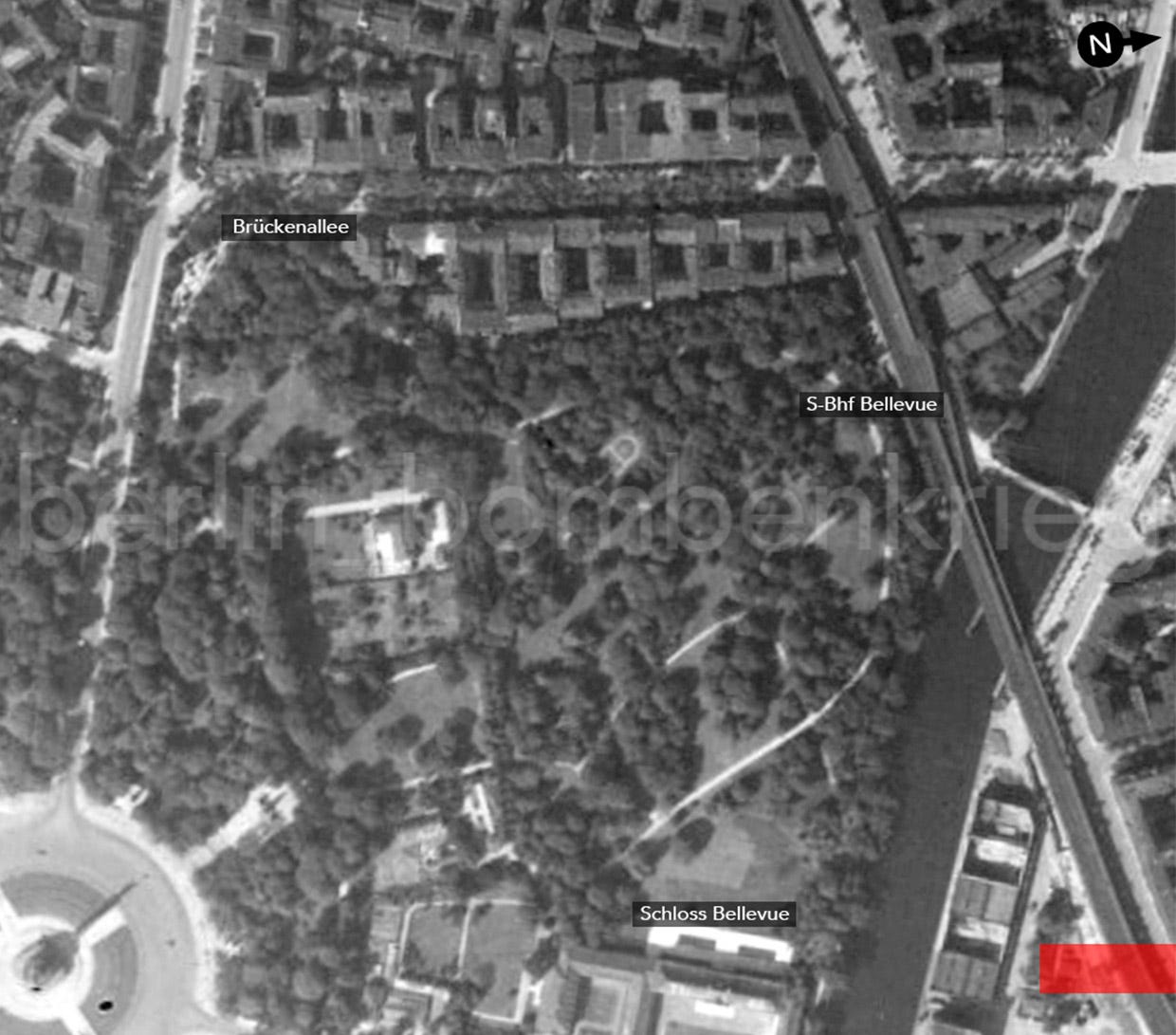 Otherwise, we continue the search on a westward path as one caption says “west of Tiergarten”: exposure #3176 from that same PR sortie shows the Tiergarten north and Moabit areas: it is an oblique aerial photograph taken facing north west capturing Hansaplatz at upper left of the image, Schloßpark Bellevue in centre with the Moabiter Brücke next to the Spree at middle right. On the upper part of the image is the Hansaviertel built-up area and S-Bahnhof Bellevue. The ruined and flattened condition of the district, gutted by fire, with many roofless buildings is evident. We look to the main street, Altonaer Straße and nothing strange is there, but a few metres away we got Brückenallee, and bingo!… the two rectangular-shaped structures are there.