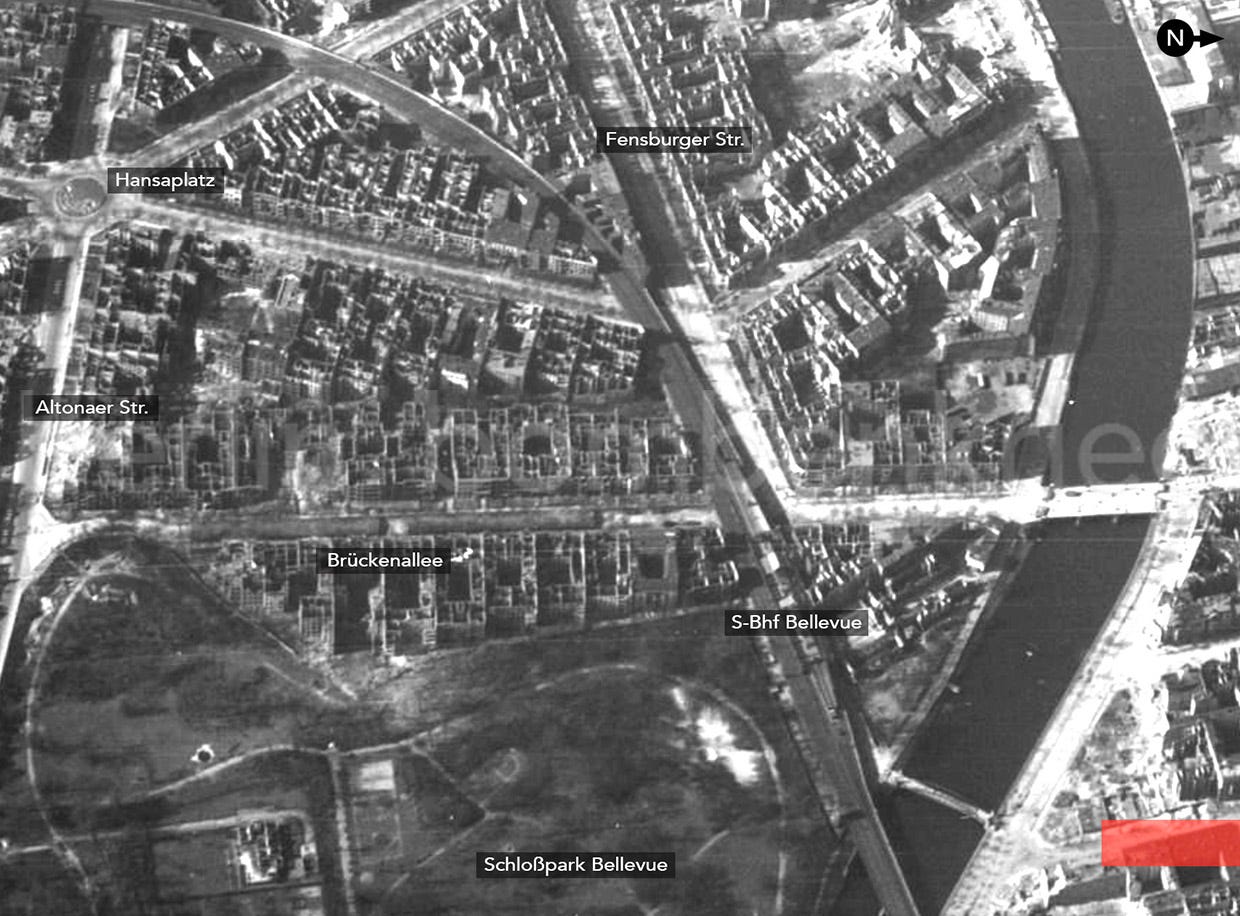 The fact that Brückenallee was a really good location for this “last-call” aircraft depot is show to good in this post-war shot of Altonaer Str and the ruined “Hansa-Viertel” area towards the Moabit district taken from top of the Siegessäule by Harry Croner in fall-winter 1945. Even from this great height the view of the street and its structures would be blocked by the buildings and the park’s tree line.