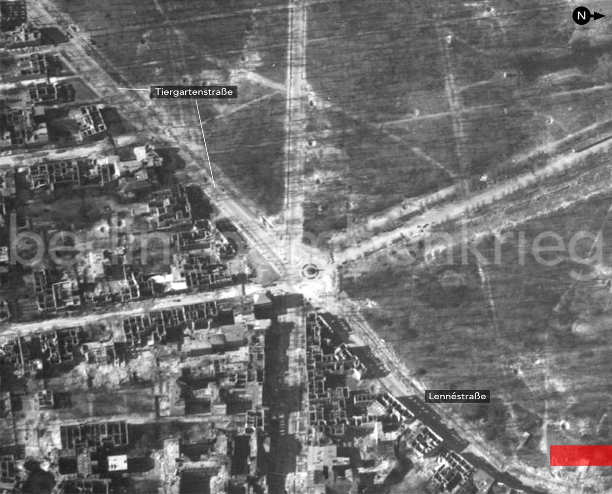 First, we look at the mentioned Tiergartenstr. that runs from Potsdamer Platz in the south to the Hofjägerallee at the northern end but no large structures or nothing like that or closer was found there: some minor debris with bomb craters and damaged buildings but the street is practically clear.