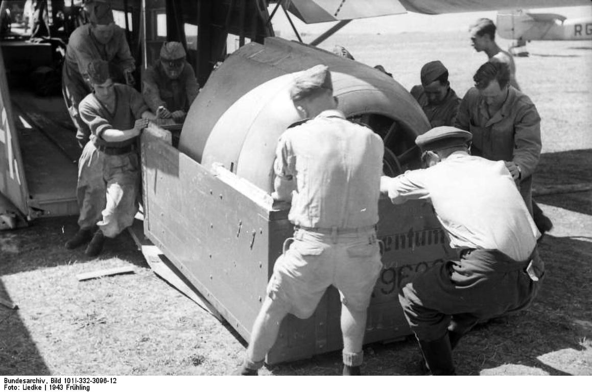 More evidence of this are the wooden crates seen at right inside the second structure: many aircraft of those years had a modular design which makes easier to replace the damaged parts on the field by the mechanics; in the case of the engine, spare or new units were shipped in a modular pack known by the Germans as the ‘kraftei’ (“power-egg”). Here, a new BMW 801 radial aero-engine is unloaded by Luftwaffe ground crew from a Go 242 cargo glider in the Russian front in 1943. Note the lettering ‘Eigentum’ and code number stenciled on the crate, similar to the ones found inside the Berlin-Tiergarten ‘hangars’. Of course, they could contain anything, not only aircraft engines like this one, but it confirms that it was equipment property of the Wehrmacht.