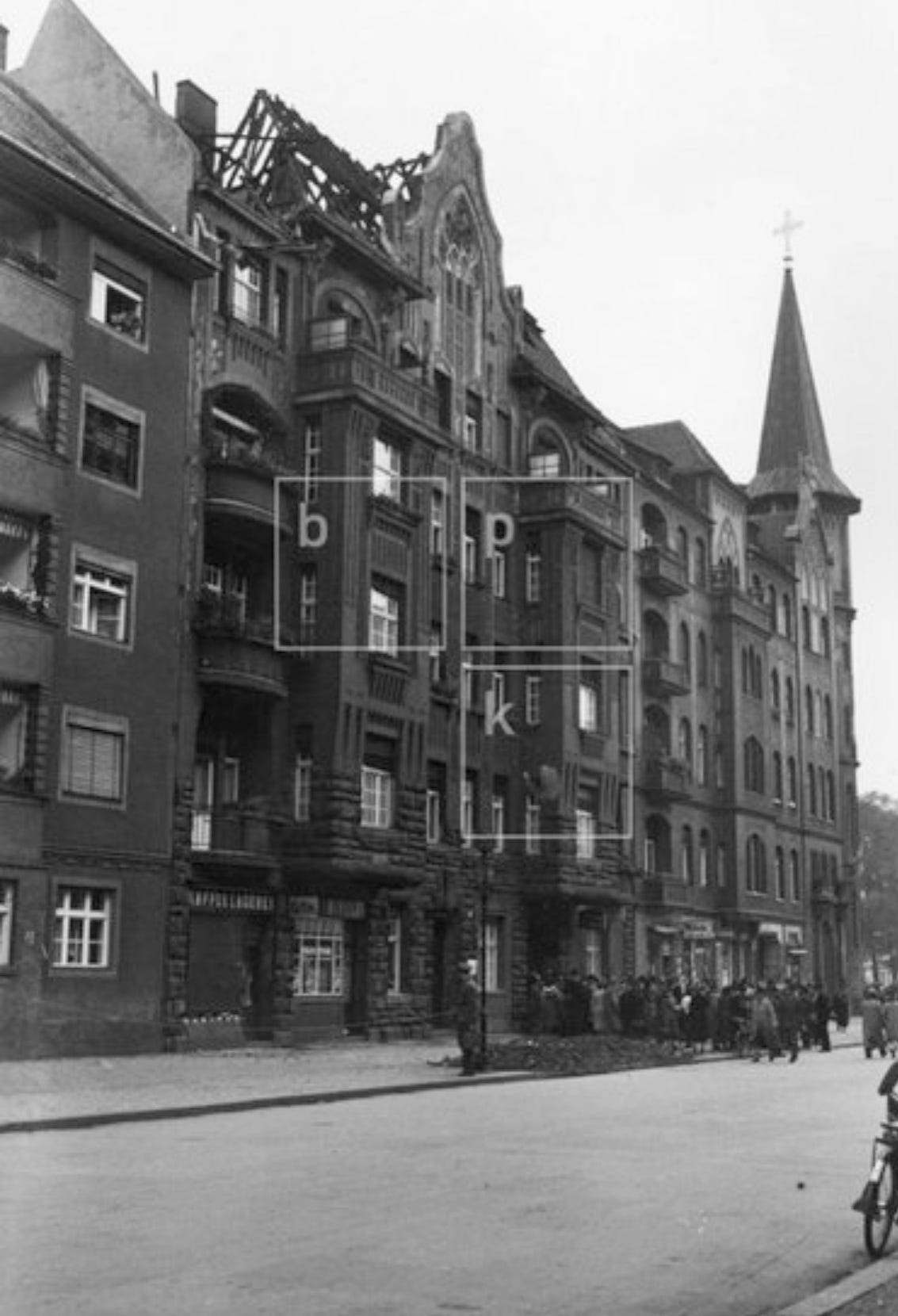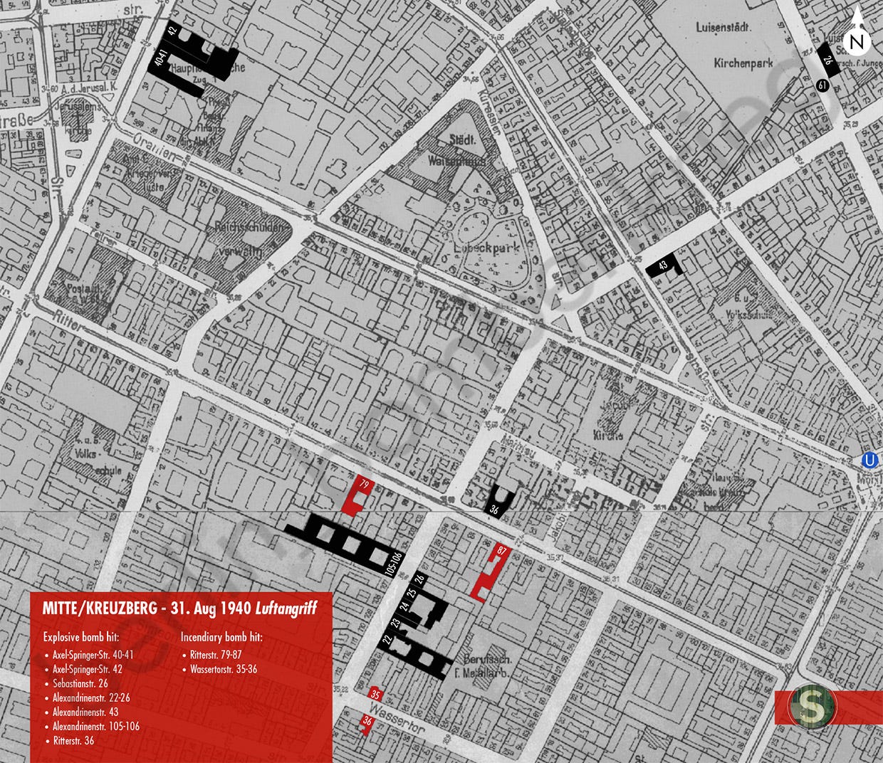 Most of the bombs fell on the southeastern residential district of Kreuzberg, where caused severe damage with fires and some buildings collapse. In Alexandrinenstraße 22-26 and 105-106, roof fires were started after several explosive bombs hit the area and in Nr 43 an explosive bomb destroyed the roof structure. At Ritterstraße 79-87 roof truss fires were reported and the tram overhead lines were also destroyed here. One more explosive hit the street in front of number 36, a large commercial building, home of the August Wellner Söhne AG Metallwaren-Fabrik: the blast destroyed a gas street lamp and caused heavy damage to the facade smashing every window, further significant damage affected all houses within a radius of about 100 metres with more explosions in the adjacent Mathieustraße. A block away, another bomb hit Wassertorstr. 35 causing heavy damage on the roof and last floor.8