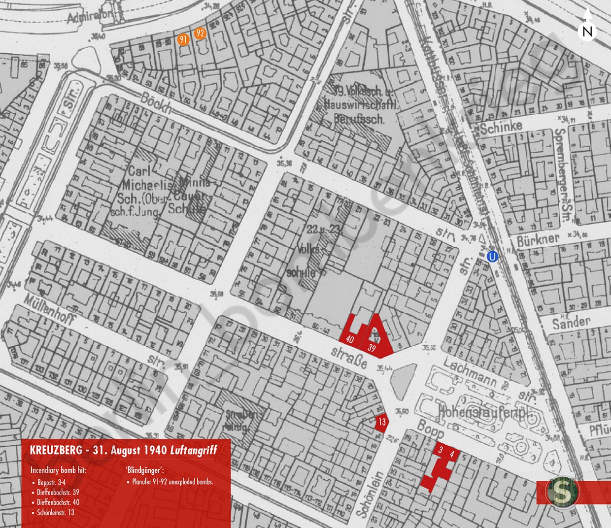 As on previous raids, the Abschlußmeldung des Kommandos der Schutzpolizei recorded every bomb hit and issued on September 28th a report that allow us to list all the damage taken by the districts on that night. The Berlin-Mitte district was hit by several high explosive bombs: in Axel-Springer-Straße (part of Lindenstraße until 1996) an 125 kg explosive bomb fell on number 40-41 where the Hauptfeuerwache (main fire station) was located, causing heavy damage on the frontyard’s window panels, garage doors and several pipes. It blasted a six-foot crater in the stone pavement. Another HE bomb hit the adjacent Reichstierärztekammer headquarters in Nr 42, which destroyed the roof structure and top floors of the building, with some debris falling on the courtyard of the fire station too. A third bomb hit Sebastianstr 26, damaging the Luisenstadt Schüle and destroying the apartments across the street, number 61.7