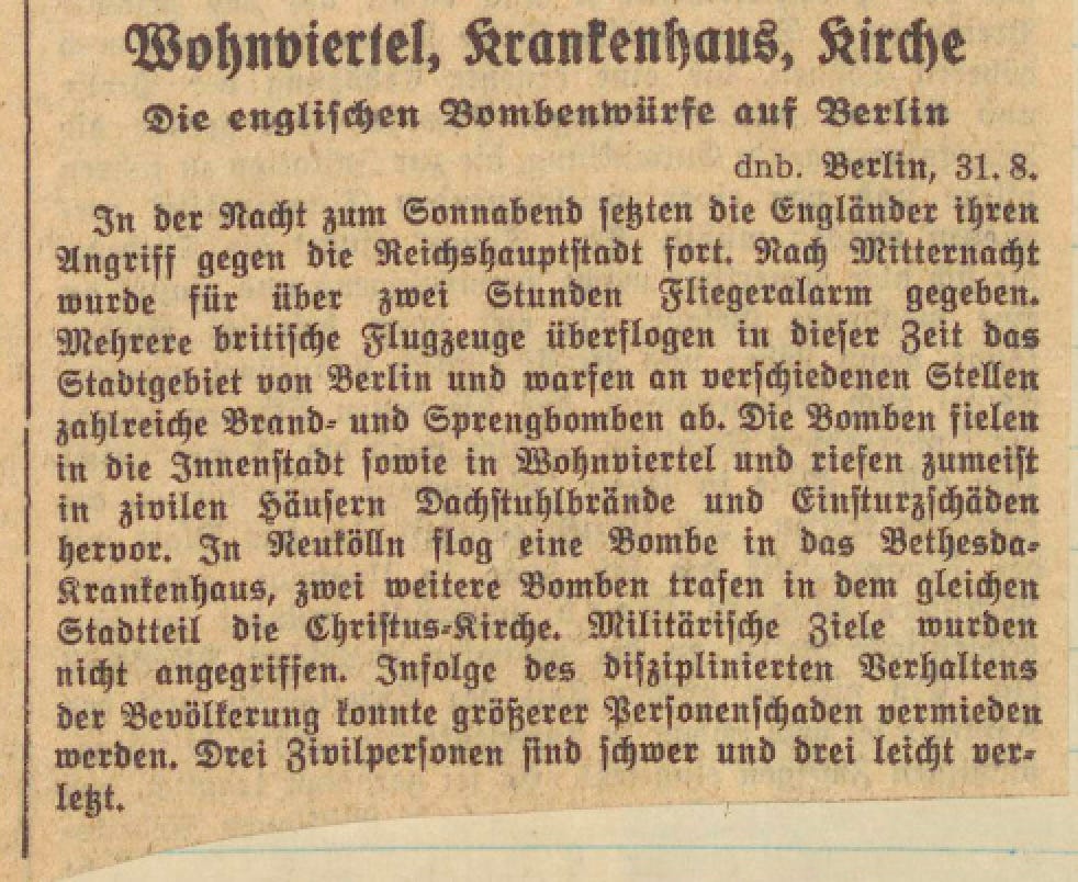 Deutsches Nachrichtenbüro report from 31 Aug. 1940; Deutsche Allgemeine Zeitung, 31 Aug. 1940; MOORHOUSE, Roger. Berlin at war. Life and death in Hitler’s capital, 1939-45. Vintage Books, 2011. p 141