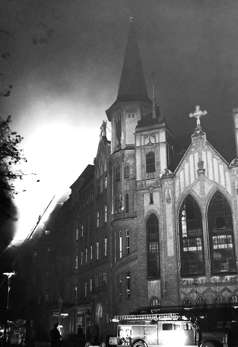 A stick of enemy’s incendiary bombs fell on the Hohenstaufenplatz surrounds, hitting the side wing of the Bethesda Hospital at Dieffenbachstraße 39. Police reported that the patients were prepared for evacuation but the fire was soon curbed and the hospital was not in danger. Two more incendiary bombs set a fire in the adjacent evangelisch-methodistische Christus-Kirche but thanks to a Hauswarten that put them out, only two pews and small sections of the floor were charred.9 More bomb hits were reported at Boppstr. 3-4 and Schönleinstr. 13, and in Planufer 91-92, where a pair of ‘duds’ found forced some Berliners to be evacuated from their houses.10