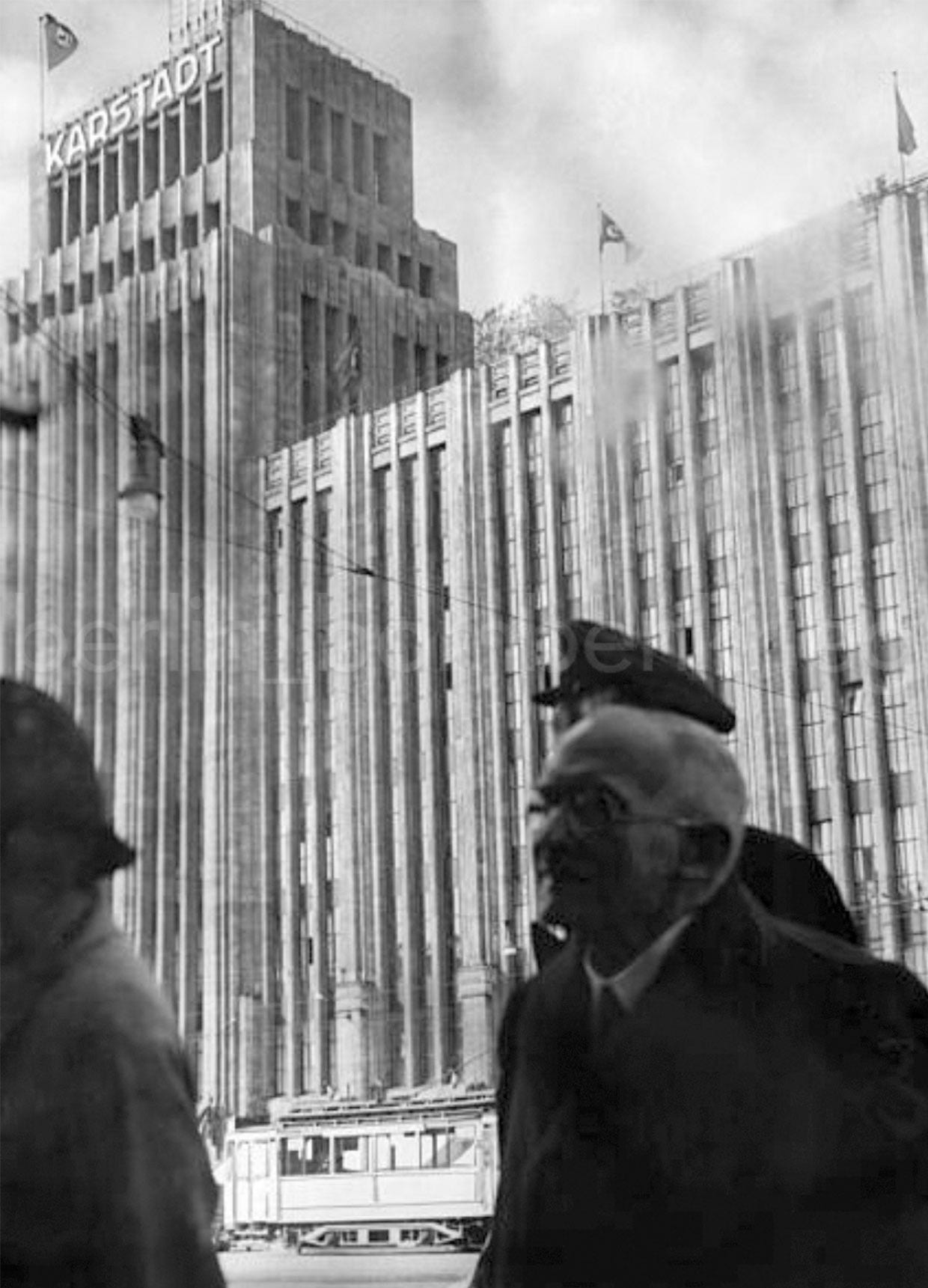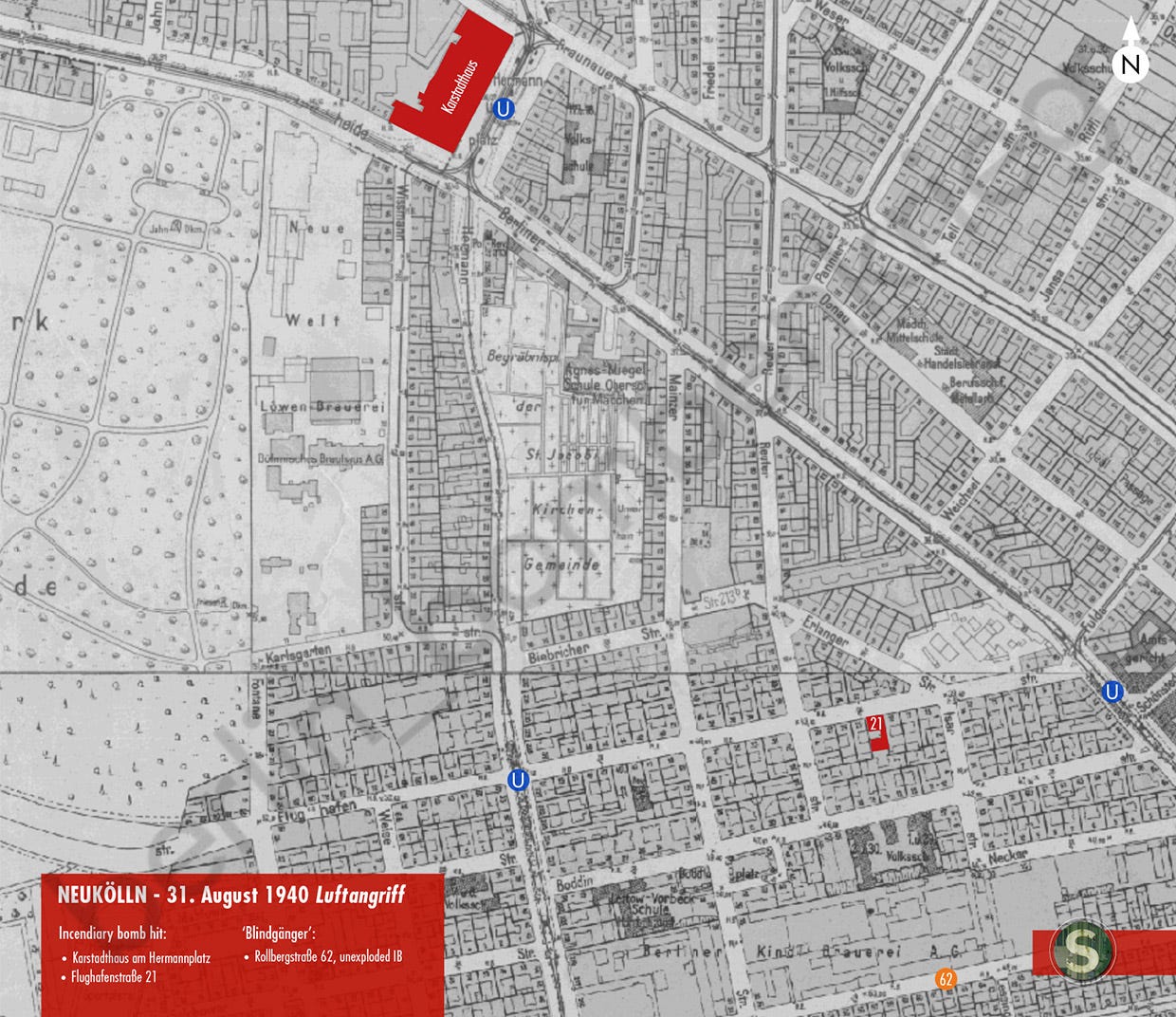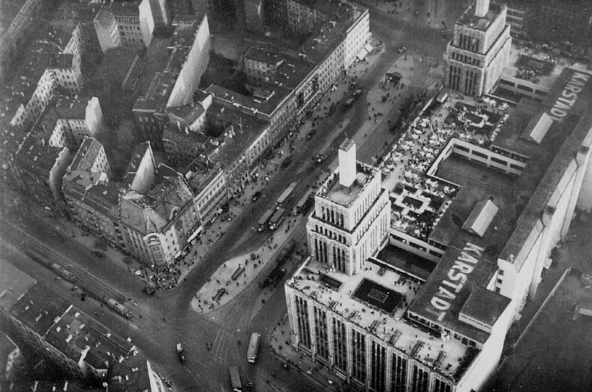 In the Neukölln ‘Kiez’, a small fire began at Flughafenstraße when an incendiary bomb fell on the roof building of street number 21 and a ‘dud’ from a fire-bomb was found at Jägerstraße 62 too (today’s Rollbergstr.), in front of the Berliner Kindl Brauerei, but the biggest headlines went to the fire bomb on the Karstadthaus’ roof garden at Hermannplatz. The bomb was thrown onto the street by RLB members, damaging the tram’s high-voltage line.11