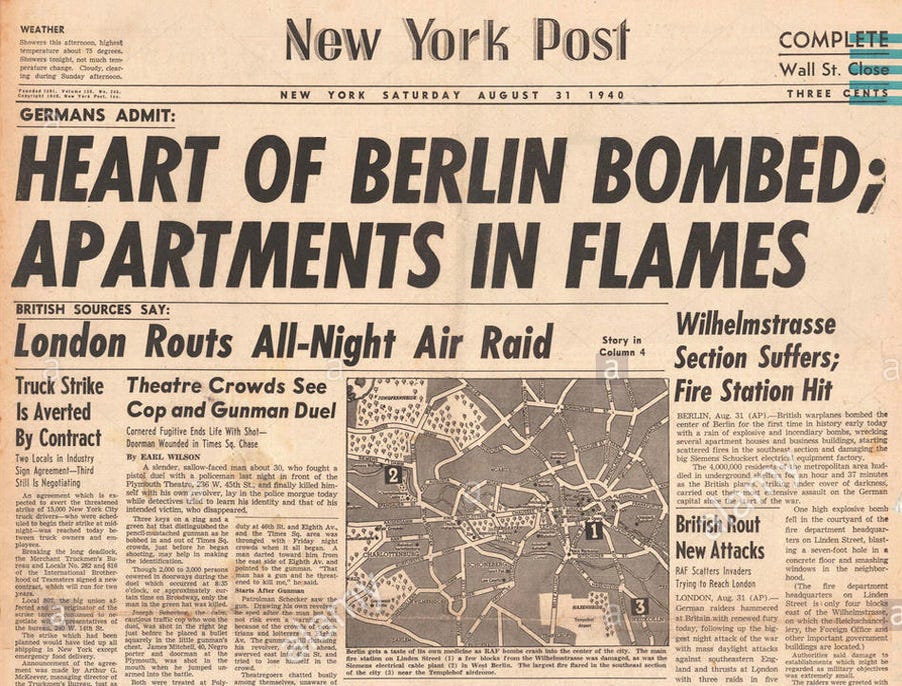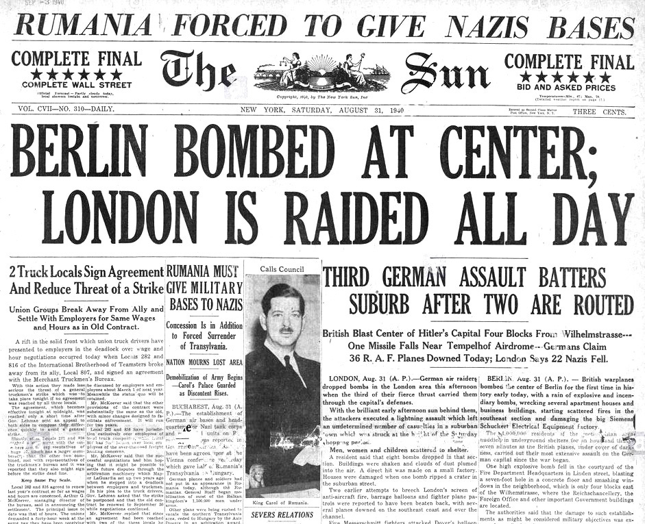 report in the New York Post, Saturday August 31, 1940, page 1. “British blast center of Hitler’s capital four blocks from Wilhelmstrasse” and “Apartments in flames” were among other big headlines published by British journals.
