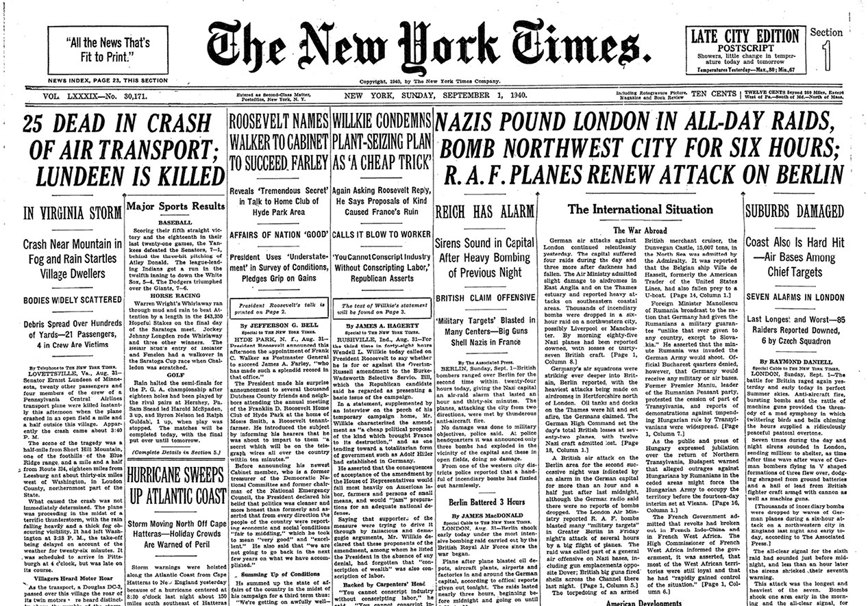 Associated Press to the New York Times, Sunday, September 1, 1940, page 1