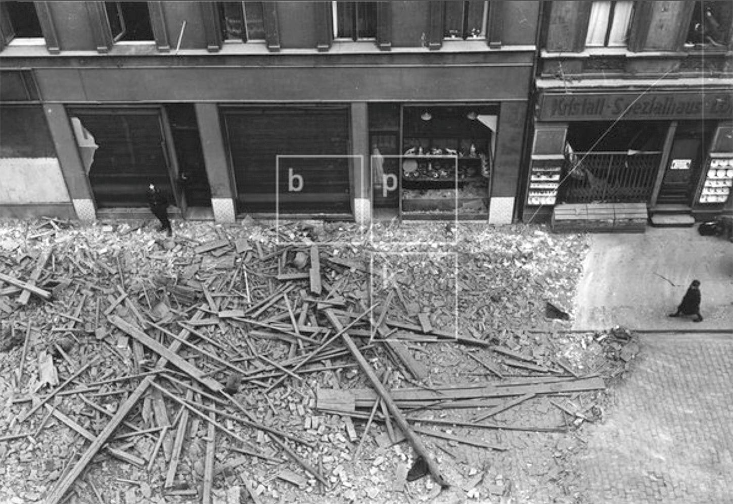 As on previous air attacks, German records listed every damage reported and bomb hit noted in the Greater Berlin area in the following hours after the British raiders left the city. At the city centre, the Berlin-Mitte administrative district reported slight damage with just one bomb hit at Alte Jakobstraße 93-95 where a gas candelabra was damaged.6