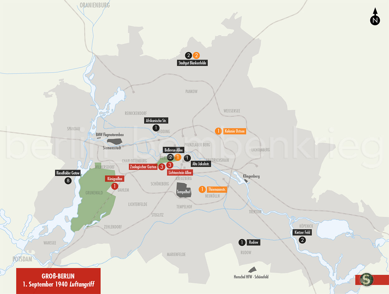 Percival Knauth wireless to The New York Times, Monday, September 2, 1940, pages 1-2; see also LAB, A Rep. 001-02, Nr. 700, Bl. 12. Shirer wrote in his diary: Tiergarten was roped off today and this evening the press admits that “several bomb craters” were discovered in the park after last night’s raid. SHIRER, William. Berlin Diary - The Journal of a Foreign Correspondent 1934-41. Alfred A Knopf, 1941, pp 493-4