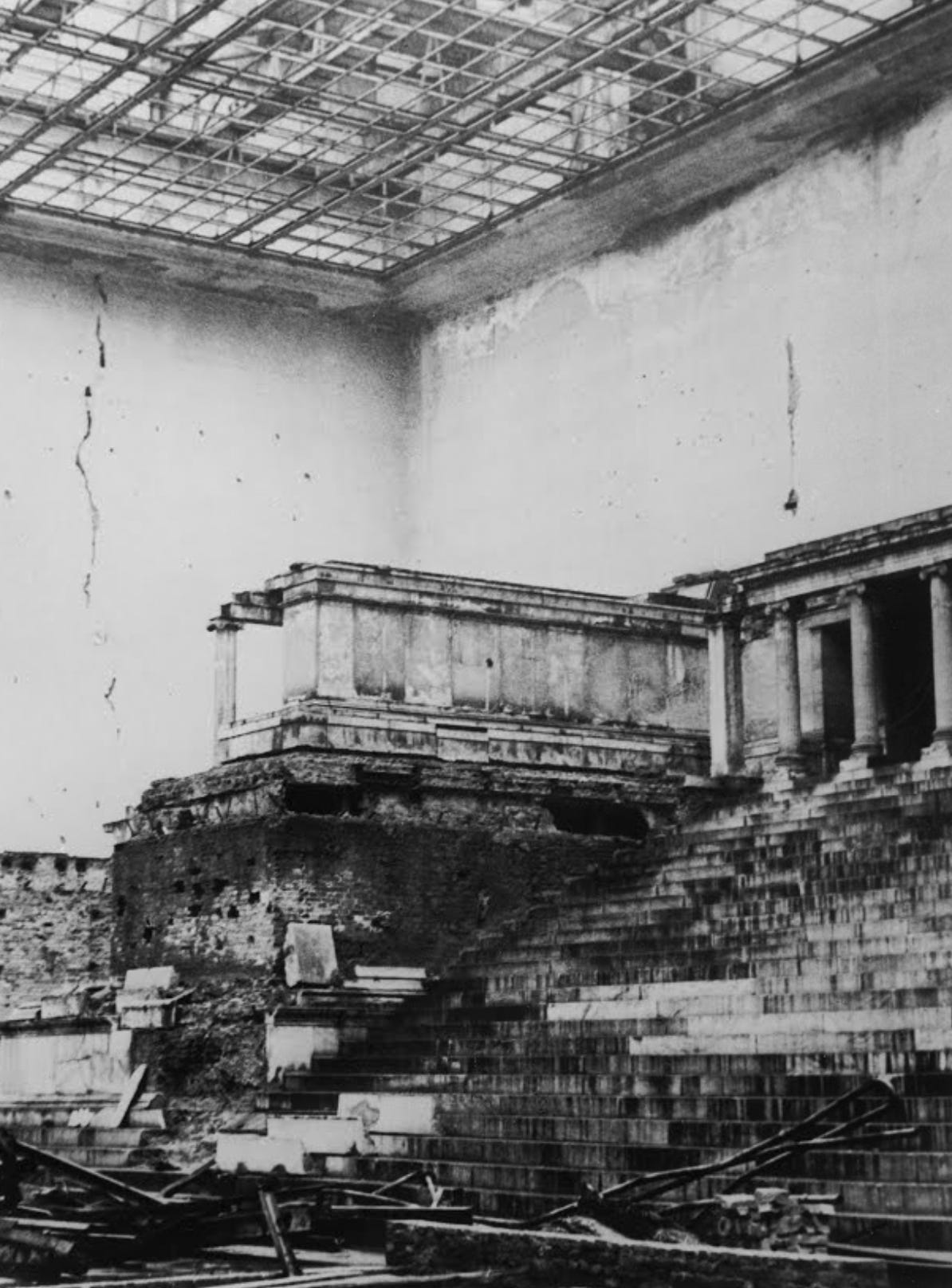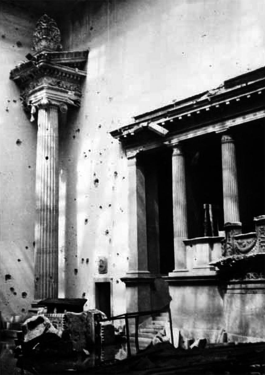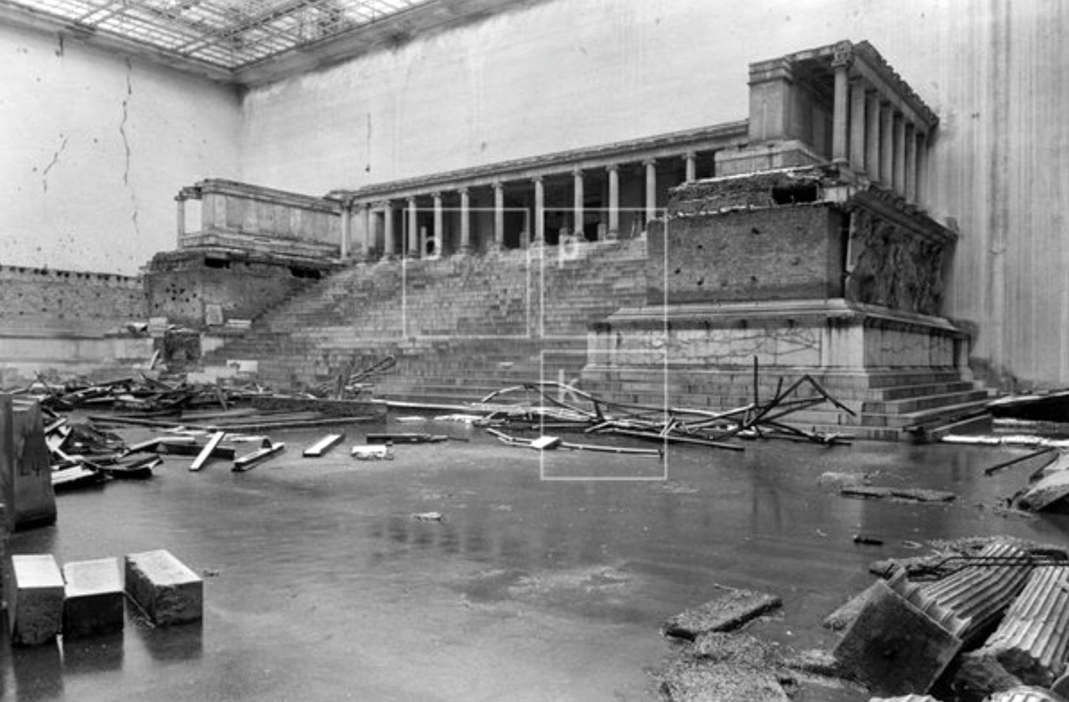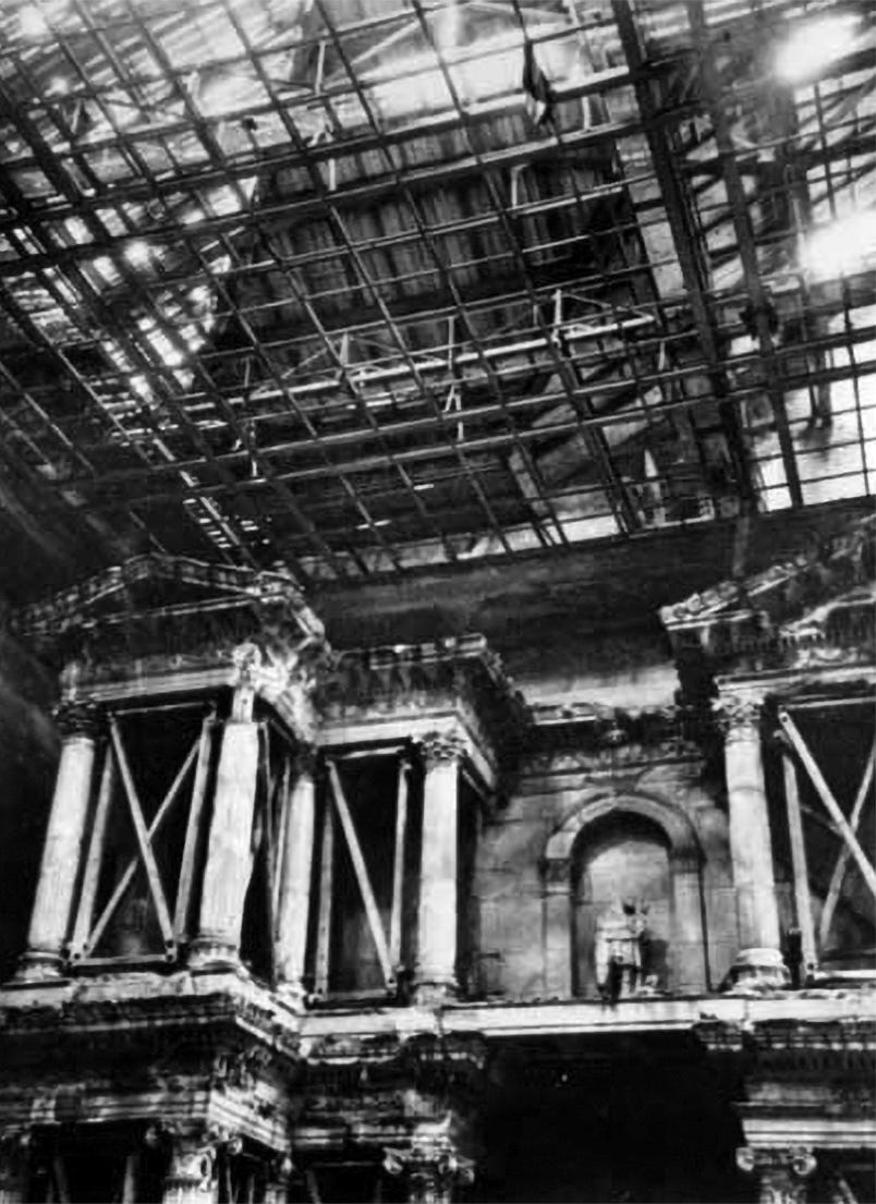 The main hall of the museum, which housed the reconstructed Great Altar is seen after the war with severe damage to the walls, the stairway and the colonnade. The destroyed glass roof allowed further damage with debris and exposure to elements.