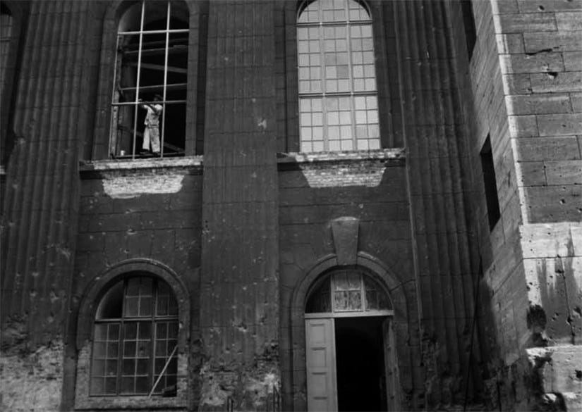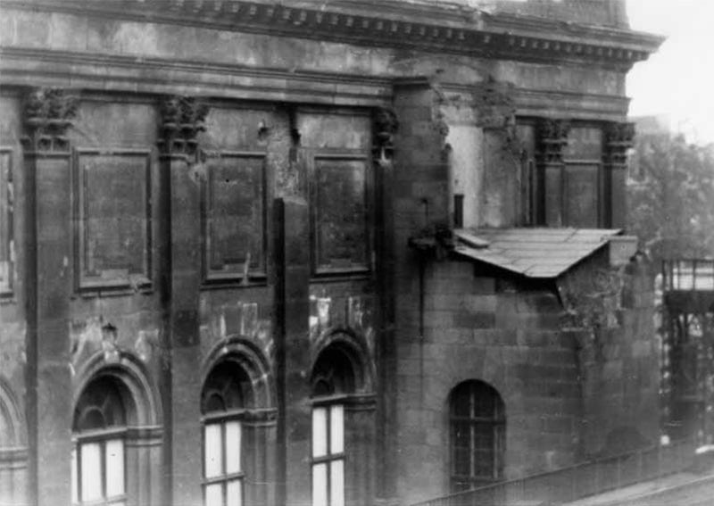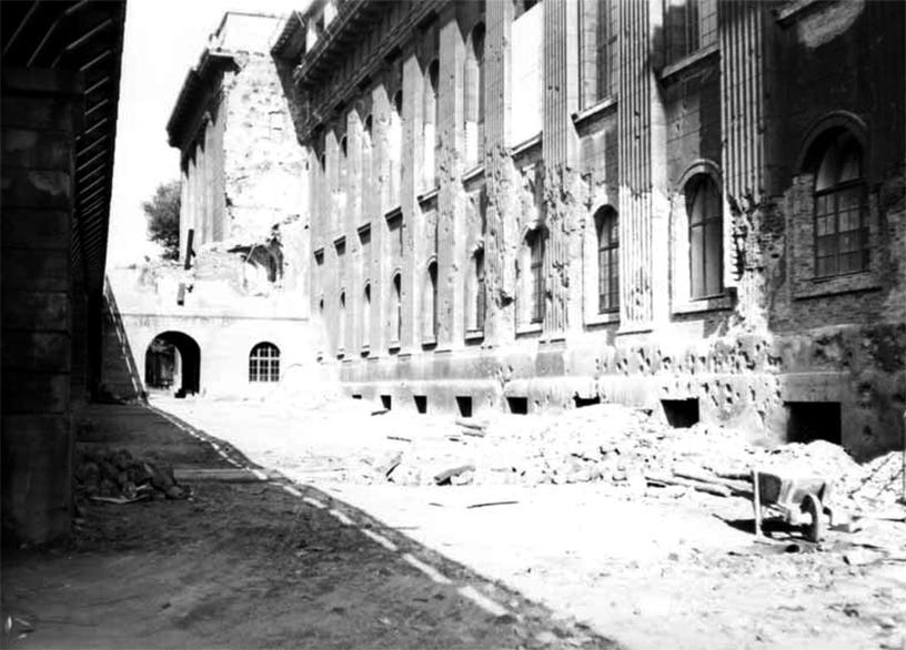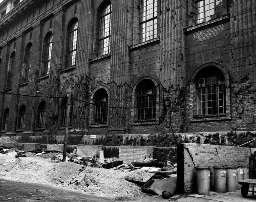 The facade of the building was completely scarred by shrapnel and explosions from bombs and fire, of which evidence remains today, and by the intense fighting that took place on its perimeter. These pictures show bullet holes and shrapnel marks on the north wing of the museum, in 1945. The S-Bahn railway is seen at left.