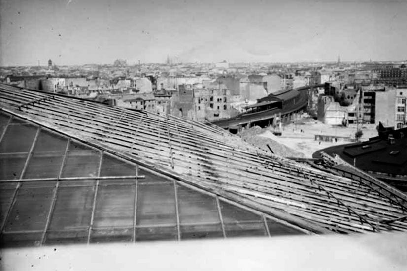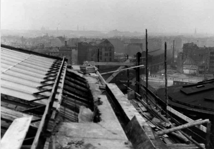 These two pictures were taken from the partly museum’s destroyed roof and with camera facing east, showing the ruined and flattened buildings of the city after five years of sustained air bombings. The elevated train station seen at centre is S-Bahnhof Hackescher Markt, with James-Simon Park and Burgstraße just before it. Note the rounded roof of the Alte Nationalgalerie at right.