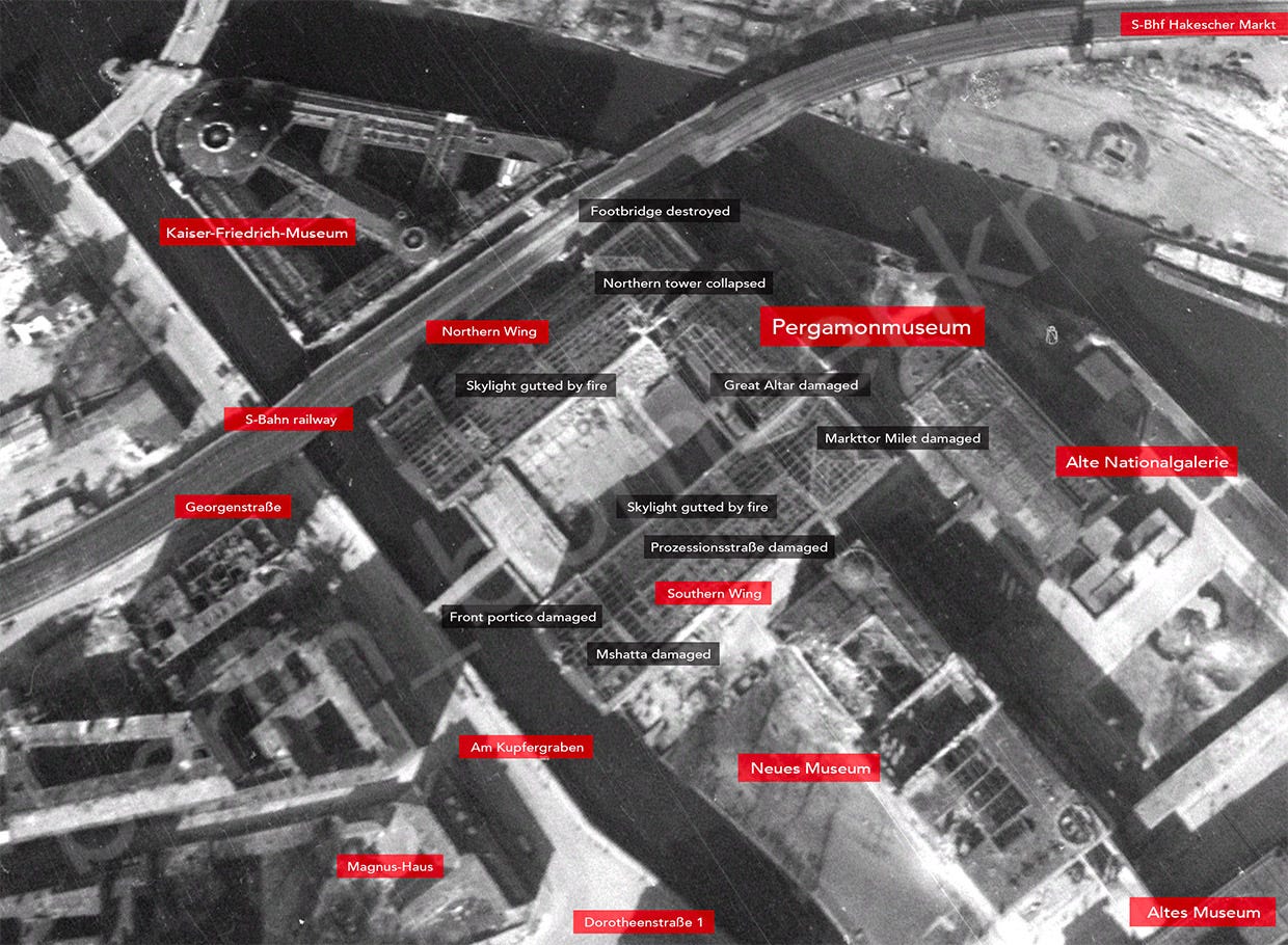 During research work about Berlin city, its streets and its inhabitants during the war and the air bombings, it is quite common to come across photos that show the ruined state and the damage caused by the war, most of them taken after the battle by the victors, some of the most remarkable buildings like the Berliner Dom or the Stadtschloss in Mitte even have nearly hundred snapshots showing damage taken in 1945. What is not so usual is to find in the archives a whole record of damage taken by the building with its corresponding image. We are fortunate that Pergamon Museum is one of the latter, with an extensive gallery of its terrible wounds caused by the Allies’ bombing campaign and the final battles with the Russians. The history and destruction of Pergamon’ during the Second World War was already told in this blog (see our previous posts - Pergamonmuseum in Berlin and Pergamonmuseum in Berlin: Post 1945) but the high number of pictures found at the Zentralarchiv der Staatlichen Museen zu Berlin and new photos led us to share this extra gallery post showing the severe damage inflicted to one of the most beautiful places in the German capital.