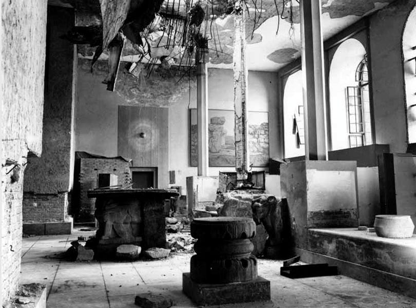 War damage to the Sendschirli-Saal of the Vorderasiatischen Museums at Pergamon’s building, 1945. Notice that one bomb has penetrated the room’s roof.