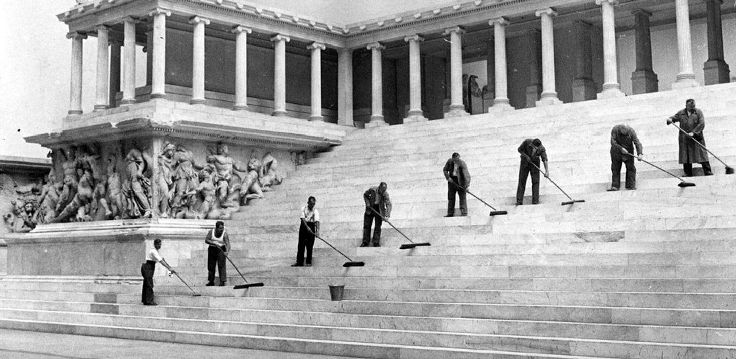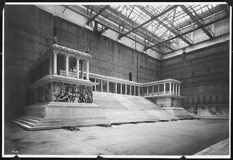 By war’s end, the new Pergamonmuseum had been open to the public just nine years before the outbreak of the Second World War obligated to close it, and had become a ruined building only fifteen years after its glorious inauguration.