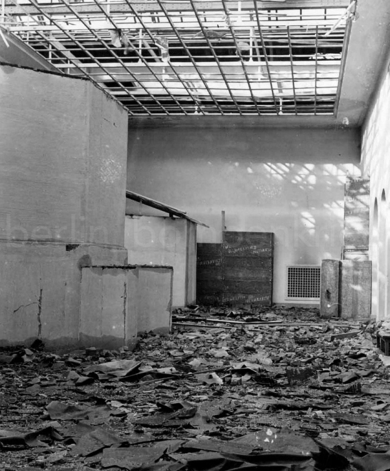 Pergamonmuseum, now a closed site, was finally hit during the British RAF heavy air raid on 28/29 January 1944 -677 bombers were dispatched to bomb Berlin with heavy losses- by a stick of incendiary bombs (more than 300,000 were dropped during the raid) that caused severe damage to the building’s roof and the skylights. The museum was hit again during the big US strike on Berlin Mitte on February 3, 1945 (937 heavy bombers), several bombs caused great damage on the building, including the Mschatta’s room and destroyed the footbridge which linked the Kaiser-Friedrich-Museum.