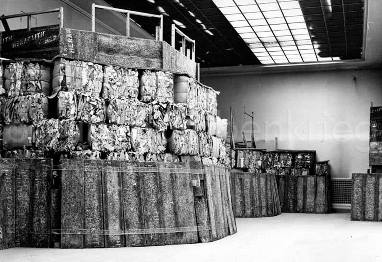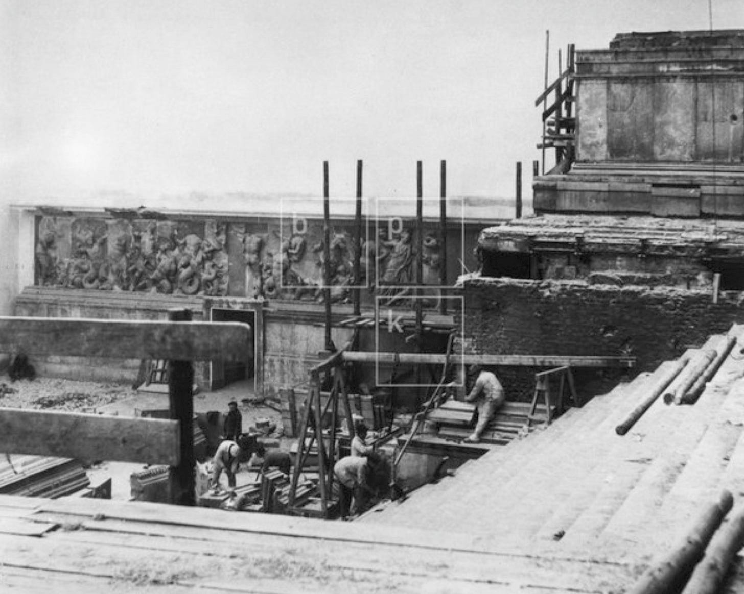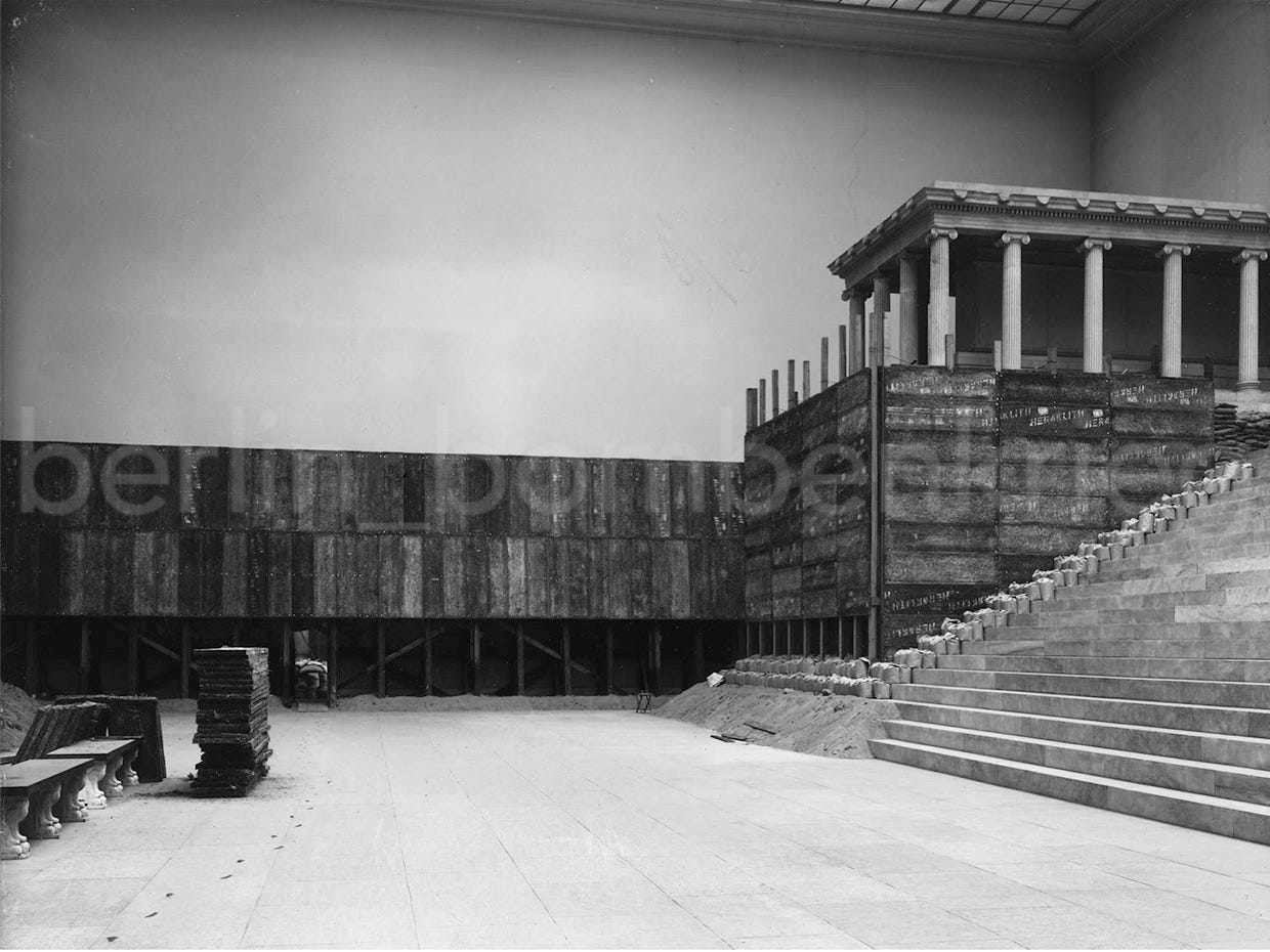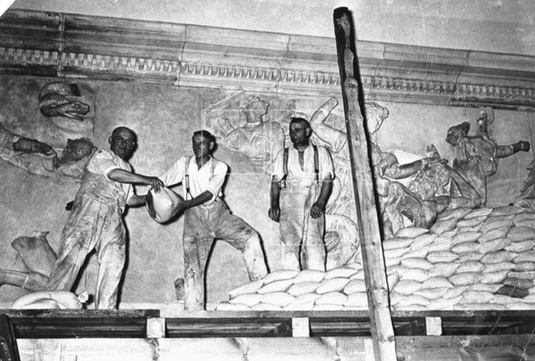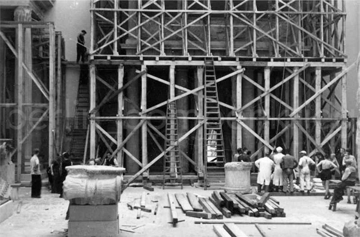 As the RAF air bombings on the city intensified in September 1940, the Führer ordered Generalbauinspekteur Albert Speer urgently the start of a self-defence program under the name of ‘Führer-Sofortprogramm’ (“Emergency program”): air-raid shelters were constructed, a more careful blackout policy was implemented and the main cultural buildings and monuments were protected with masonry and sandbags from the effects of the war from the air. This included Pergamon, which was closed to public since then and secured: basement windows were walled in, and the friezes of the Great Altar, the hall and the other rooms were covered with sandbags and wooden-walls.