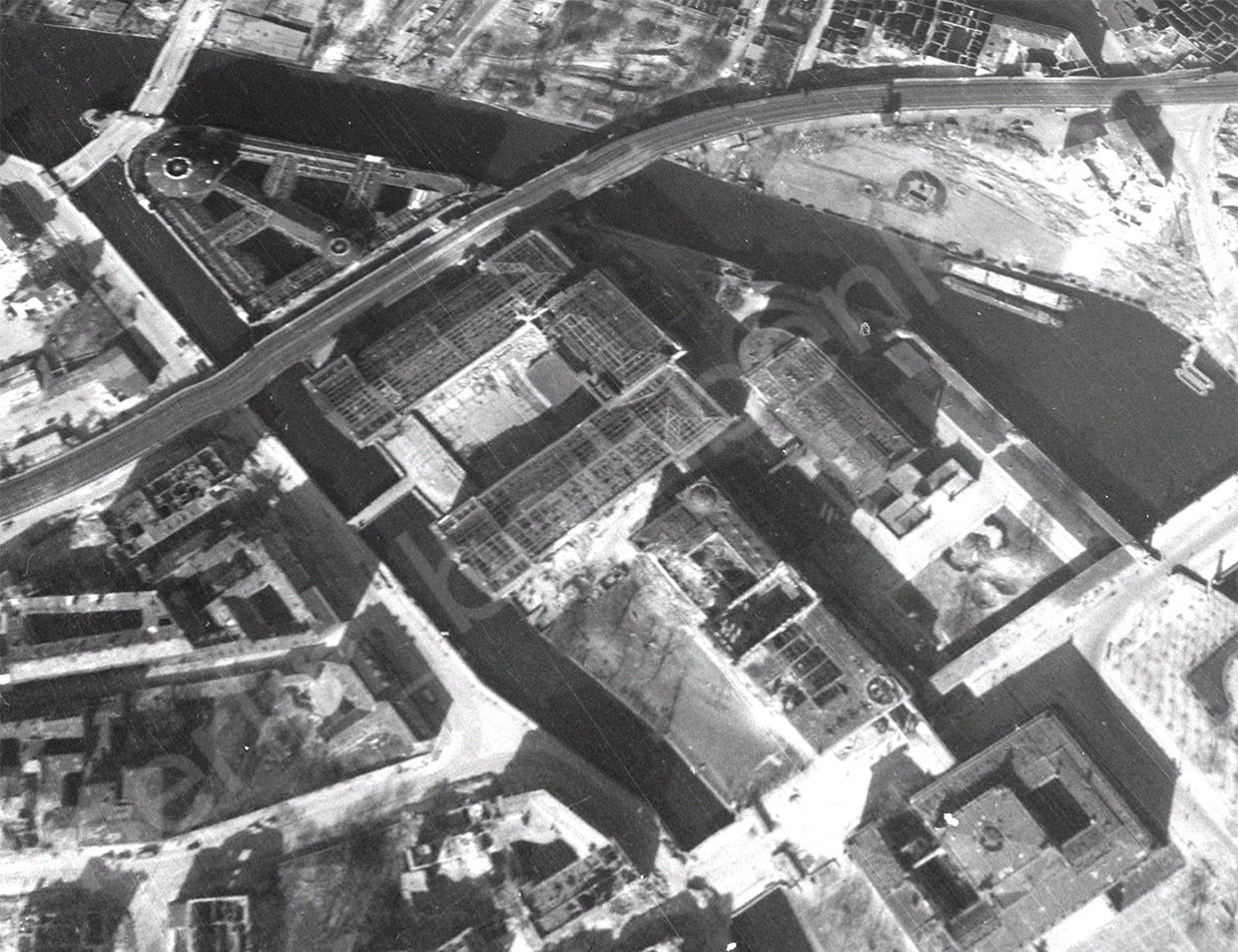 This is an US reconnaissance image taken on 22 March 1945 by PR aircraft of the 22nd Photographic Reconnaissance Squadron over Berlin-Mitte, showing the damage inflicted to the Museumsinsel and the destroyed skylight roof of the Pergamonmuseum, gutted by fire. Note the adjacent bombed out Neues Museum, all before the ground battles of April-May.