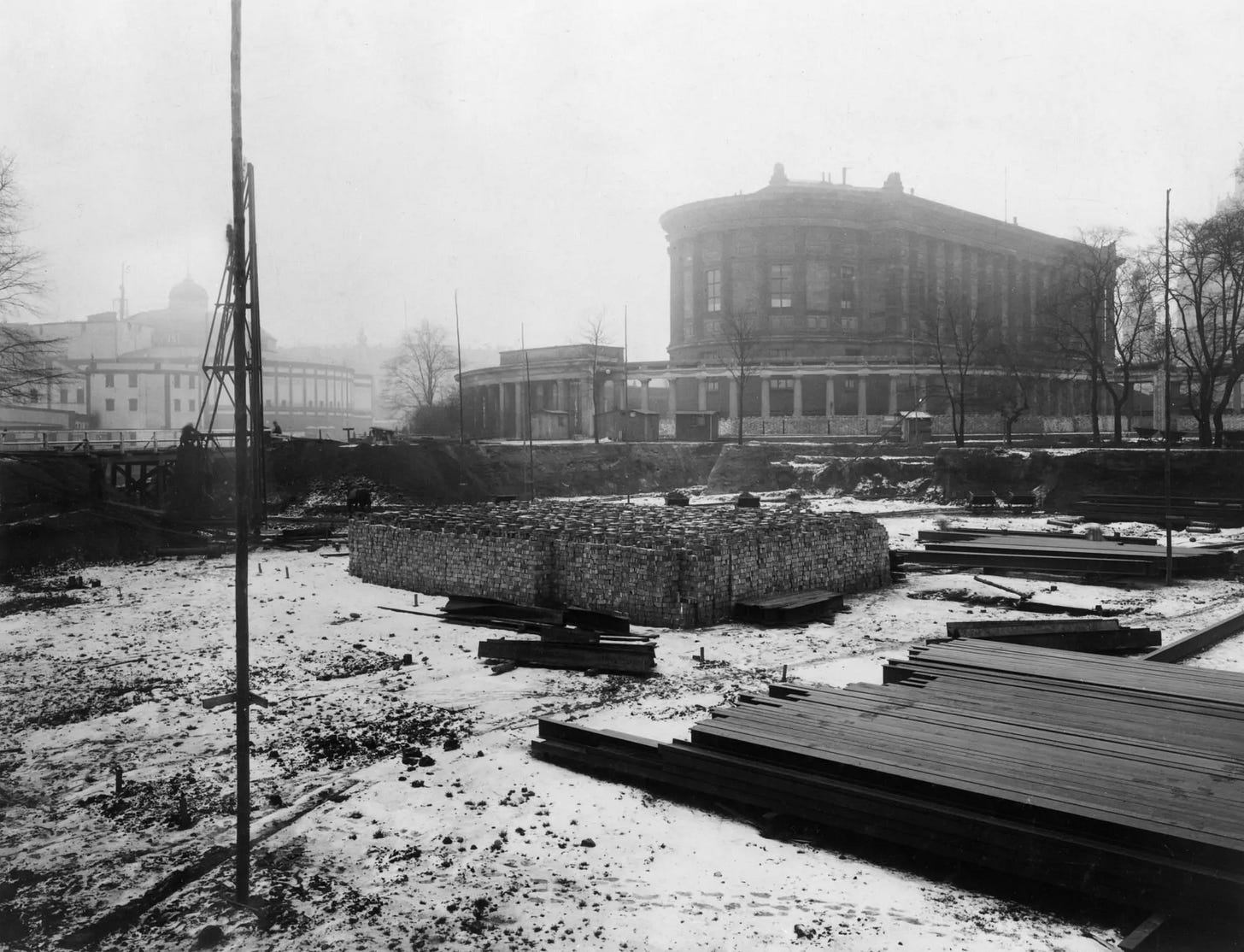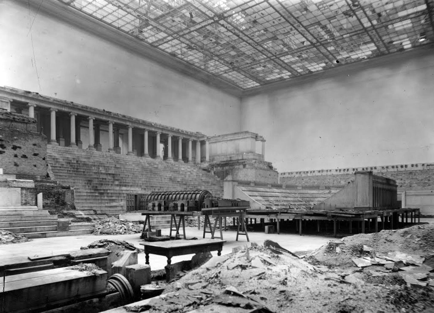 Bomb-damage to the museum room that houses the reconstructed Markttor von Milet (Market Gate of Miletus) and the Trajanshalle in 1943, which were secured by a wooden structure and sandbags. The two-storey gate combined Greek and Roman elements from 180 AD. It was discovered in 1903 by Germans Theodor Wiegand and Hubert Knackfuß and its fragments carried to Berlin.