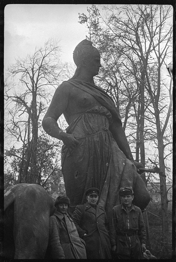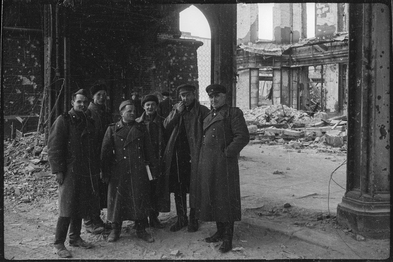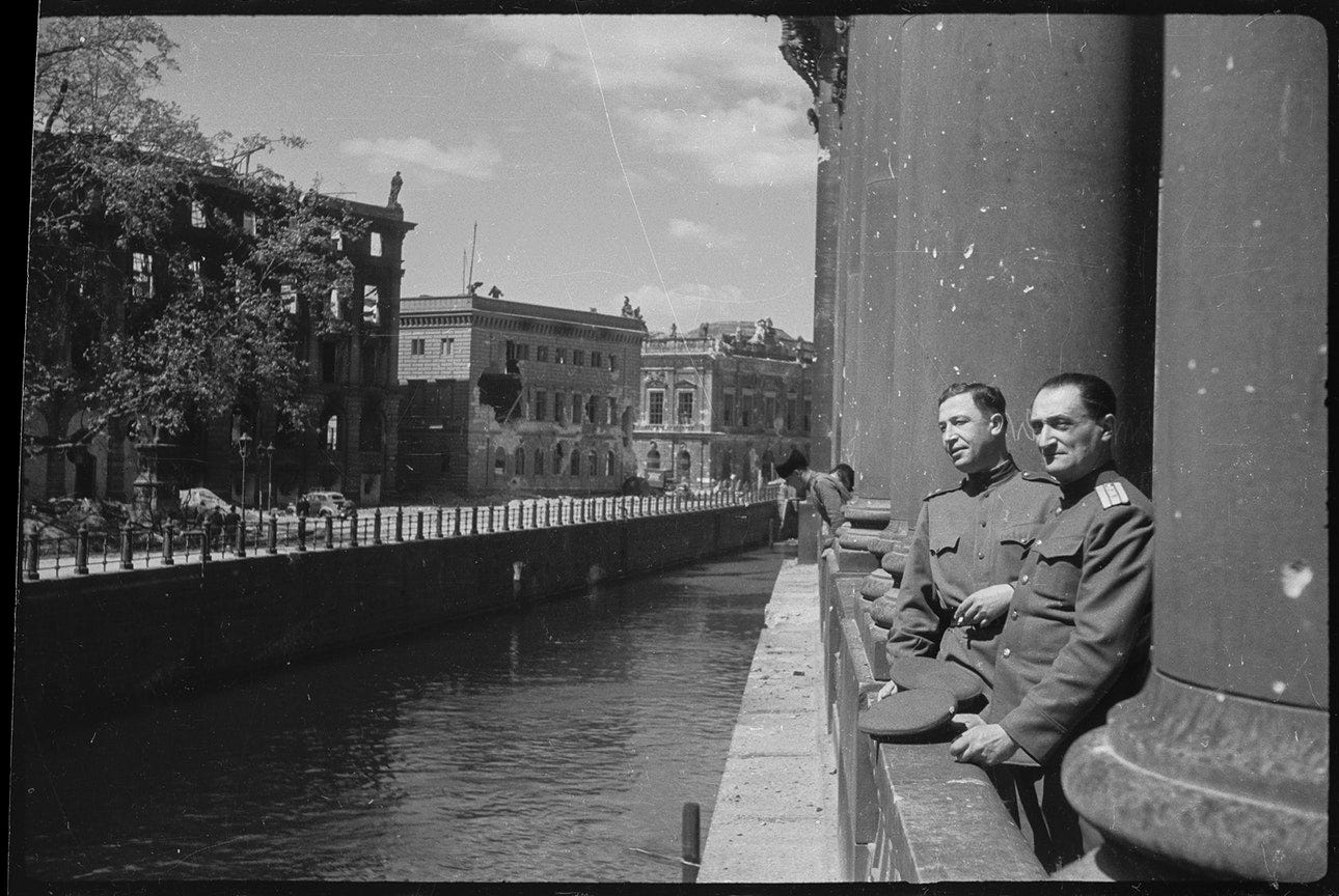 Major S L Rogatchevsky, a Soviet medical officer, poses next to a propaganda slogan painted on a wall by SS members during the battle that reads: ‘Berlin stays German!’. Possibly located at Einbecker Straße. Photo: © Valery Faminsky, Arthur Bondar’s private collection. Berlin, May 1945. Three ‘Ivans’ smile to camera with the Siegessäule column as a trophy background. Photo: © Valery Faminsky, Arthur Bondar’s private collection. Berlin, May 1945. Soviet troops with a heavy tank IS-2 with Gen Albrecht Graf von Roon’s statue behind at Großer Stern , Straße des 17. Juni. Photo: © Valery Faminsky, Arthur Bondar’s private collection. Berlin, May 1945. The new conquerors of the German capital began their domain over the city, here we see the reading of the surrender in the streets, 8 May 1945. Photo: © Valery Faminsky, Arthur Bondar’s private collection. Berlin, May 1945. Photo: © Valery Faminsky, Arthur Bondar’s private collection. Berlin, May 1945. A group of Russian officers and soldiers at the Oberbaumbrücke . Photo: © Valery Faminsky, Arthur Bondar’s private collection. Berlin, May 1945. A view of Falckensteinstraße after the war. Photo: © Valery Faminsky, Arthur Bondar’s private collection. Berlin, May 1945. A Soviet officer posing for a snapshot next to the Siegessäule am Charlottenburger Chaussee, heute Straße des 17. Juni. Photo: © Valery Faminsky, Arthur Bondar’s private collection. Berlin, May 1945. The same officer stands in front of the ruined structure of Alexanderplatz Bahnhof. Photo: © Valery Faminsky, Arthur Bondar’s private collection. Berlin, May 1945. Another Soviet officer poses in front of one of the lion statues part of Kaiser-Wilhelm-Nationaldenkmals . Notice bullet damage on the lion’s pedestal and the destroyed Dom at extreme left. Photo: © Valery Faminsky, Arthur Bondar’s private collection. Berlin, May 1945. More Soviet officers at the Kaiser-Wilhelm monument in Berlin-Mitte. Photo: © Valery Faminsky, Arthur Bondar’s private collection. Berlin, May 1945. A portrait of two of them at Kaiser-Wilhelm-Nationaldenkmals vor dem Stadtschloss next to the Spree river. See at center of the image the Zeughaus building; out of picture at far left would be the Bauakademie (Building Academy) (info thanks to Jürgen Raddatz). Photo: © Valery Faminsky, Arthur Bondar’s private collection. Berlin, May 1945. Three Red Army members stands at Ebertstraße, posing in front of the remains of the destroyed Brandenburger Tor. Photo: © Valery Faminsky, Arthur Bondar’s private collection. Berlin, May 1945. A German FlaK 37/41 AA gun used as an anti-tank weapon in front of the Reichstag. Note that the barrel gun has been destroyed. Photo: © Valery Faminsky, Arthur Bondar’s private collection. Berlin, May 1945. Unloading a wounded soldier at the field hospital at Friedrichstraße-Ritterstraße, 1945. Photo: © Valery Faminsky, Arthur Bondar’s private collection. Berlin, May 1945. Soviet troops salutes their Red banner during a victory parade at Scheidemnanstraße, Platz der Republik , outside of the destroyed Reichstag on 20 May 1945. Photo: © Valery Faminsky, Arthur Bondar’s private collection. Berlin, May 1945. Russian soldiers playing a captured piano in Berlin streets. Photo: © Valery Faminsky, Arthur Bondar’s private collection. Berlin, May 1945. Photo: © Valery Faminsky, Arthur Bondar’s private collection. Berlin, May 1945. Berlin, near Alexanderplatz, the Georgenkirche can be seen in the background of the photo. Photo: © Valery Faminsky, Arthur Bondar’s private collection. Berlin, May 1945. Photo: © Valery Faminsky, Arthur Bondar’s private collection. Berlin, May 1945 Photo: © Valery Faminsky, Arthur Bondar’s private collection. Berlin, May 1945. Photo: © Valery Faminsky, Arthur Bondar’s private collection. Berlin, May 1945