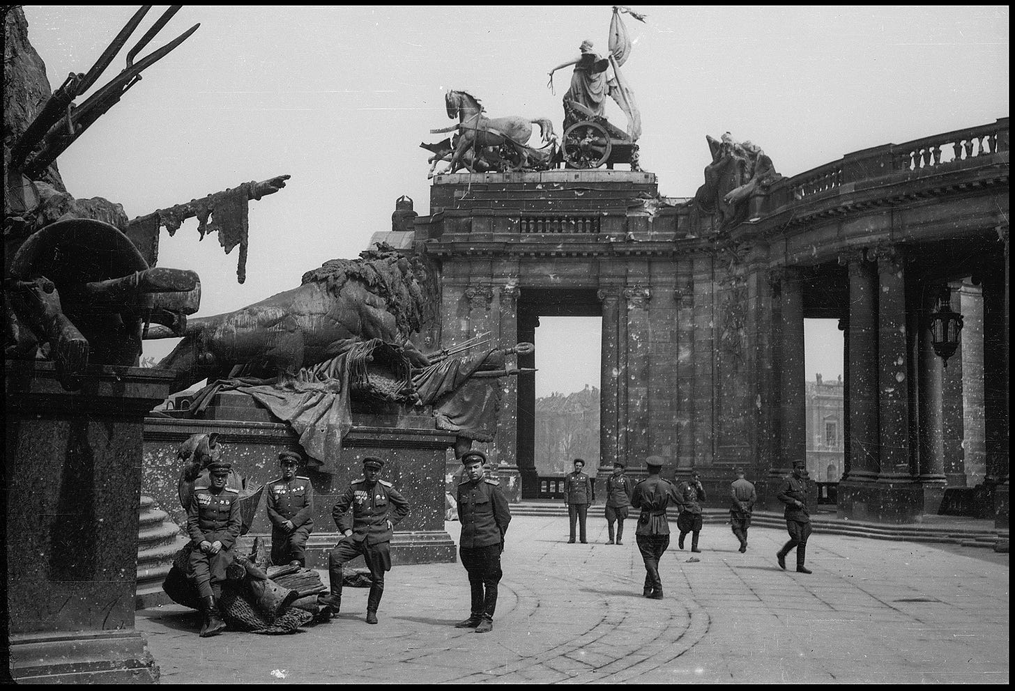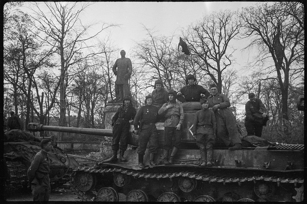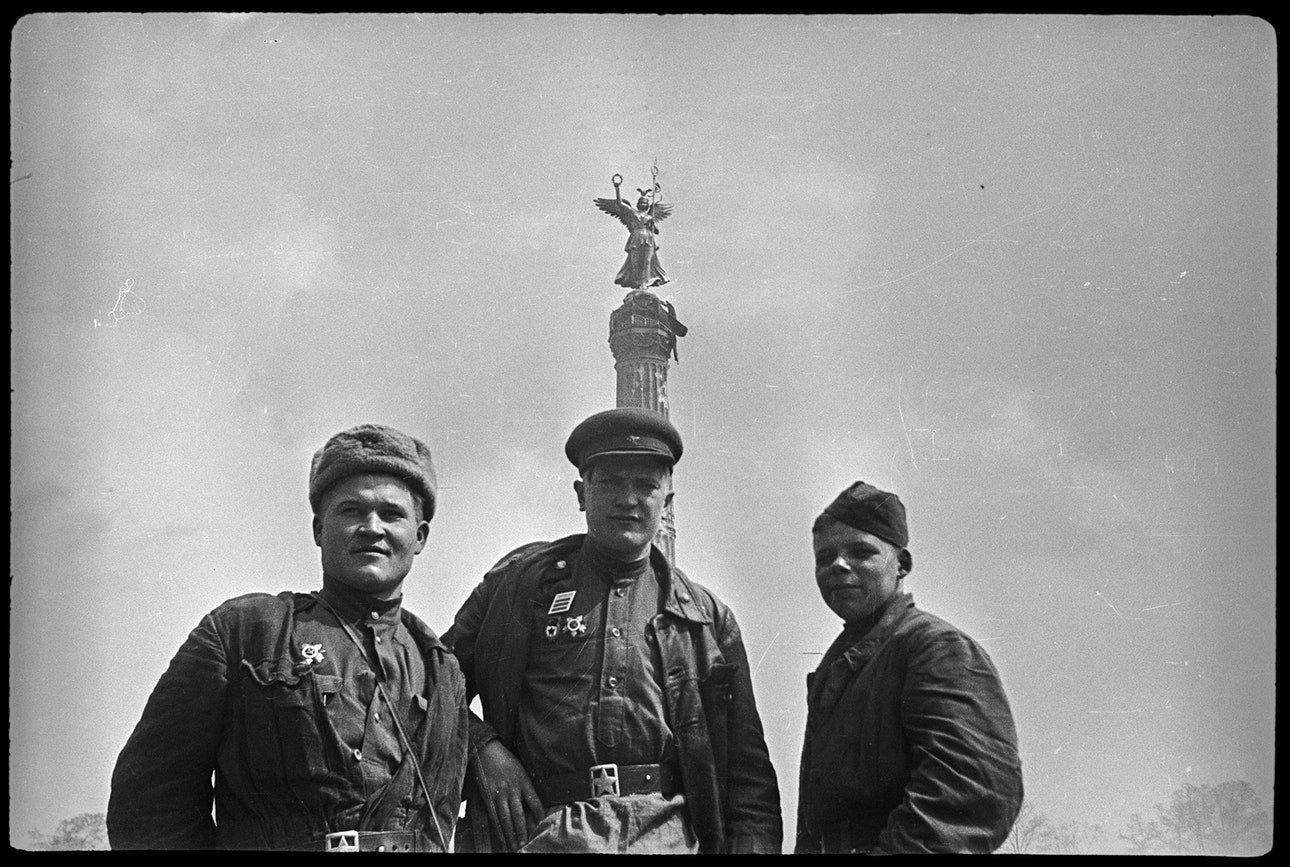 Major S L Rogatchevsky, a Soviet medical officer, poses next to a propaganda slogan painted on a wall by SS members during the battle that reads: ‘Berlin stays German!’. Possibly located at Einbecker Straße. Photo: © Valery Faminsky, Arthur Bondar’s private collection. Berlin, May 1945. Three ‘Ivans’ smile to camera with the Siegessäule column as a trophy background. Photo: © Valery Faminsky, Arthur Bondar’s private collection. Berlin, May 1945. Soviet troops with a heavy tank IS-2 with Gen Albrecht Graf von Roon’s statue behind at Großer Stern , Straße des 17. Juni. Photo: © Valery Faminsky, Arthur Bondar’s private collection. Berlin, May 1945. The new conquerors of the German capital began their domain over the city, here we see the reading of the surrender in the streets, 8 May 1945. Photo: © Valery Faminsky, Arthur Bondar’s private collection. Berlin, May 1945. Photo: © Valery Faminsky, Arthur Bondar’s private collection. Berlin, May 1945. A group of Russian officers and soldiers at the Oberbaumbrücke . Photo: © Valery Faminsky, Arthur Bondar’s private collection. Berlin, May 1945. A view of Falckensteinstraße after the war. Photo: © Valery Faminsky, Arthur Bondar’s private collection. Berlin, May 1945. A Soviet officer posing for a snapshot next to the Siegessäule am Charlottenburger Chaussee, heute Straße des 17. Juni. Photo: © Valery Faminsky, Arthur Bondar’s private collection. Berlin, May 1945. The same officer stands in front of the ruined structure of Alexanderplatz Bahnhof. Photo: © Valery Faminsky, Arthur Bondar’s private collection. Berlin, May 1945. Another Soviet officer poses in front of one of the lion statues part of Kaiser-Wilhelm-Nationaldenkmals . Notice bullet damage on the lion’s pedestal and the destroyed Dom at extreme left. Photo: © Valery Faminsky, Arthur Bondar’s private collection. Berlin, May 1945. More Soviet officers at the Kaiser-Wilhelm monument in Berlin-Mitte. Photo: © Valery Faminsky, Arthur Bondar’s private collection. Berlin, May 1945. A portrait of two of them at Kaiser-Wilhelm-Nationaldenkmals vor dem Stadtschloss next to the Spree river. See at center of the image the Zeughaus building; out of picture at far left would be the Bauakademie (Building Academy) (info thanks to Jürgen Raddatz). Photo: © Valery Faminsky, Arthur Bondar’s private collection. Berlin, May 1945. Three Red Army members stands at Ebertstraße, posing in front of the remains of the destroyed Brandenburger Tor. Photo: © Valery Faminsky, Arthur Bondar’s private collection. Berlin, May 1945. A German FlaK 37/41 AA gun used as an anti-tank weapon in front of the Reichstag. Note that the barrel gun has been destroyed. Photo: © Valery Faminsky, Arthur Bondar’s private collection. Berlin, May 1945. Unloading a wounded soldier at the field hospital at Friedrichstraße-Ritterstraße, 1945. Photo: © Valery Faminsky, Arthur Bondar’s private collection. Berlin, May 1945. Soviet troops salutes their Red banner during a victory parade at Scheidemnanstraße, Platz der Republik , outside of the destroyed Reichstag on 20 May 1945. Photo: © Valery Faminsky, Arthur Bondar’s private collection. Berlin, May 1945. Russian soldiers playing a captured piano in Berlin streets. Photo: © Valery Faminsky, Arthur Bondar’s private collection. Berlin, May 1945. Photo: © Valery Faminsky, Arthur Bondar’s private collection. Berlin, May 1945. Berlin, near Alexanderplatz, the Georgenkirche can be seen in the background of the photo. Photo: © Valery Faminsky, Arthur Bondar’s private collection. Berlin, May 1945. Photo: © Valery Faminsky, Arthur Bondar’s private collection. Berlin, May 1945 Photo: © Valery Faminsky, Arthur Bondar’s private collection. Berlin, May 1945. Photo: © Valery Faminsky, Arthur Bondar’s private collection. Berlin, May 1945