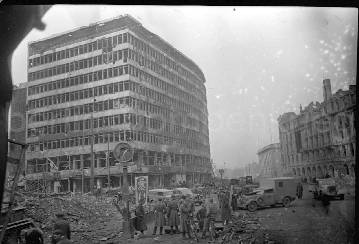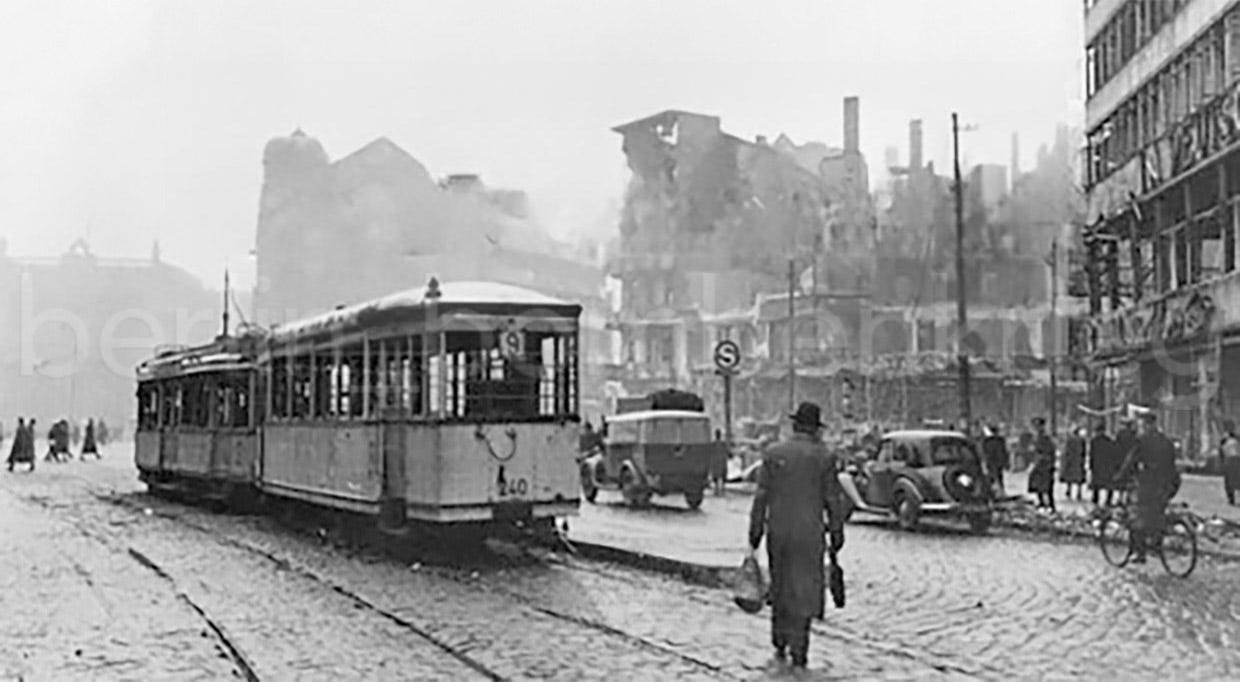 Once described as the “most heavily bombed square in Europe”, Potsdamer Platz was badly hit during the 22-26 November 1943 RAF attacks, and during the June 21, 1944 and February 26, 1945, American air raids, a prominent target due to its proximity to the adjacent railway station and the Reich’s Chancellery complex at Voßstr, just one block away. The train service finally stopped in late April 1945 among fierce street-fighting (there is no power supply due to lack of coal).