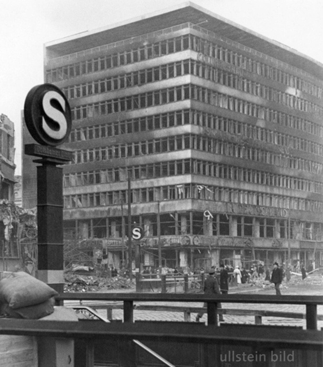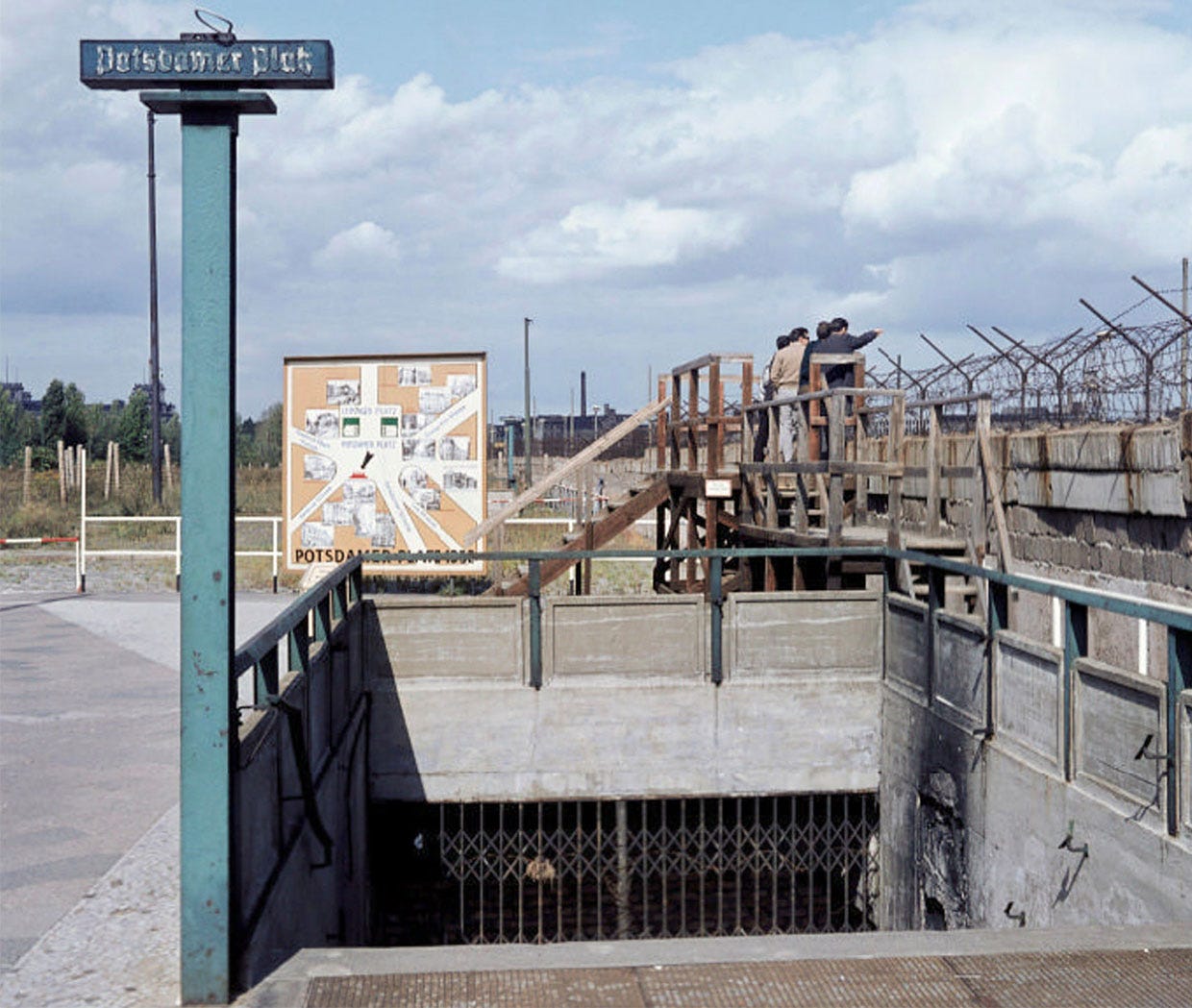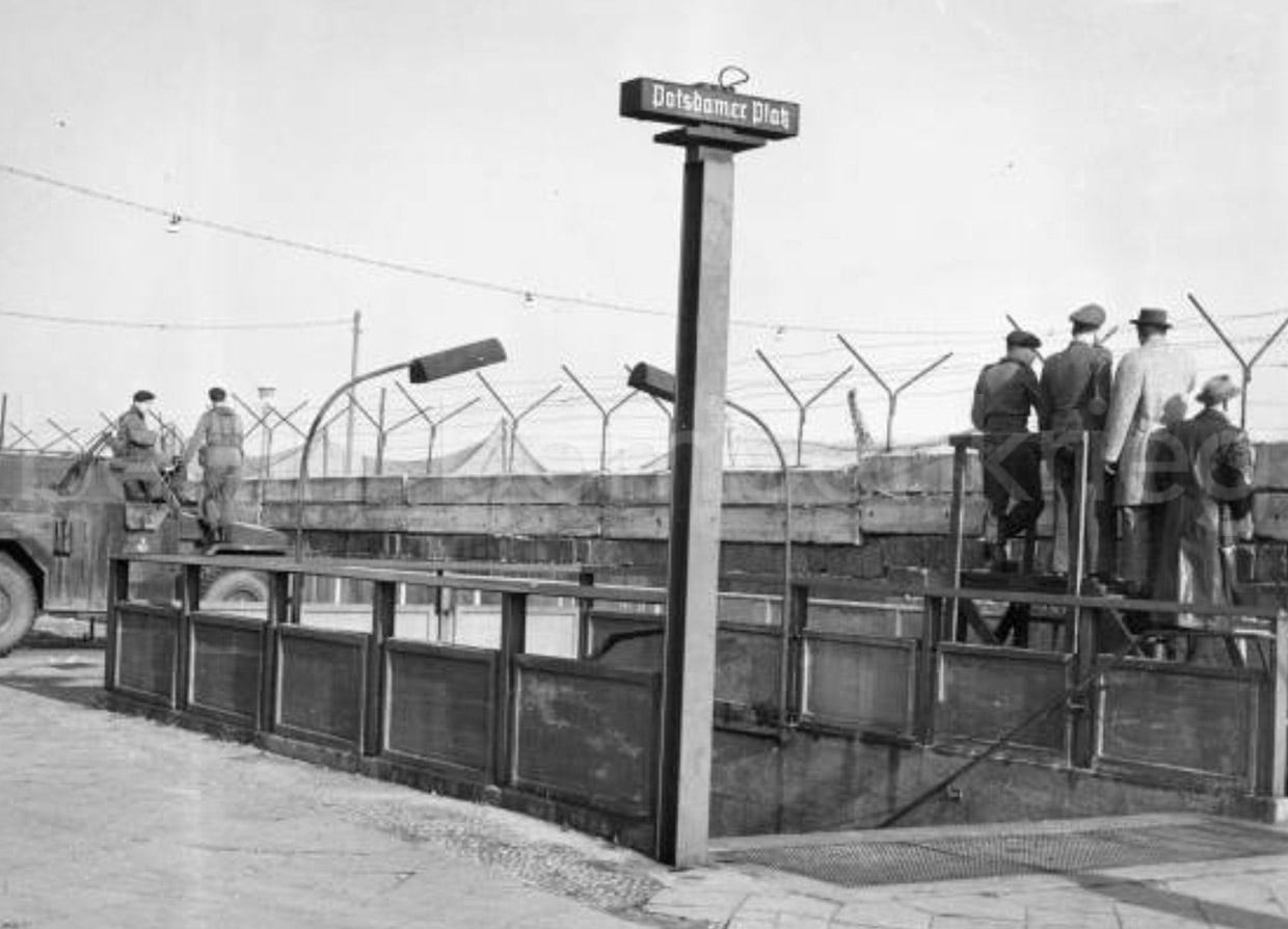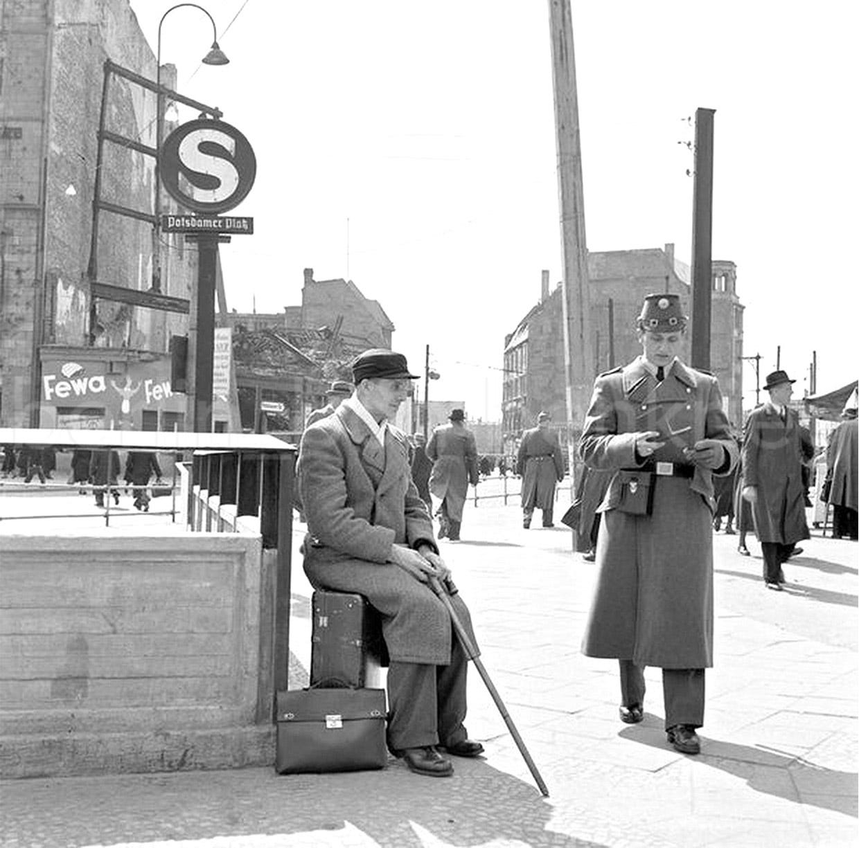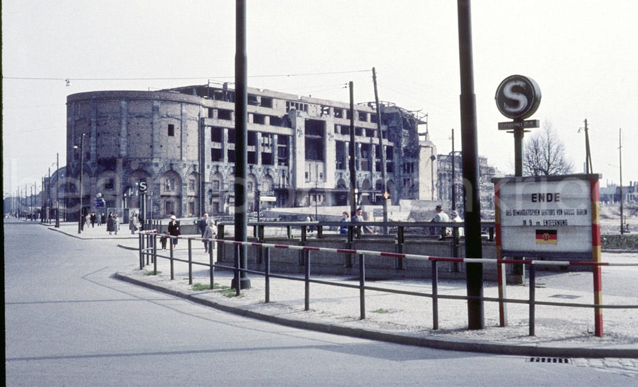 Once a busy and traffic jammed area, by 1950-60 the square, now physically divided by barbed wire, armed guards and walled up, had become mostly an open space, empty, with most pre-war buildings being demolished except for the large train station and the ghostly Haus Vaterland whose ruins remained a few years more (1976). If you look closely at 1950s pictures, some of the “S” signs seem to have been replaced by metal discs. On the contrary, if you look at 1970 and 80s photos the underground entrances are still there (closed, of course) but the circled S signs are missing, just the poles remained.