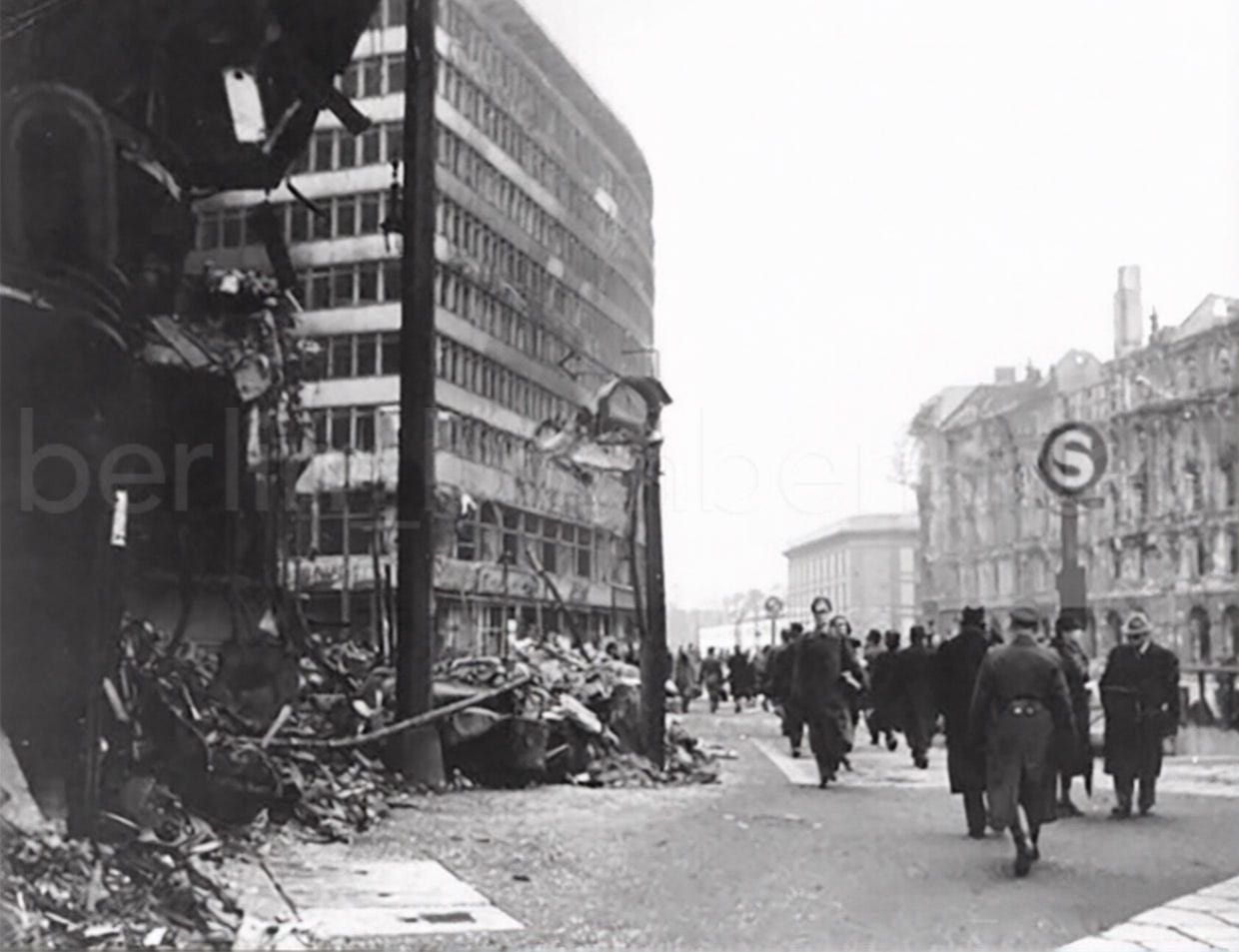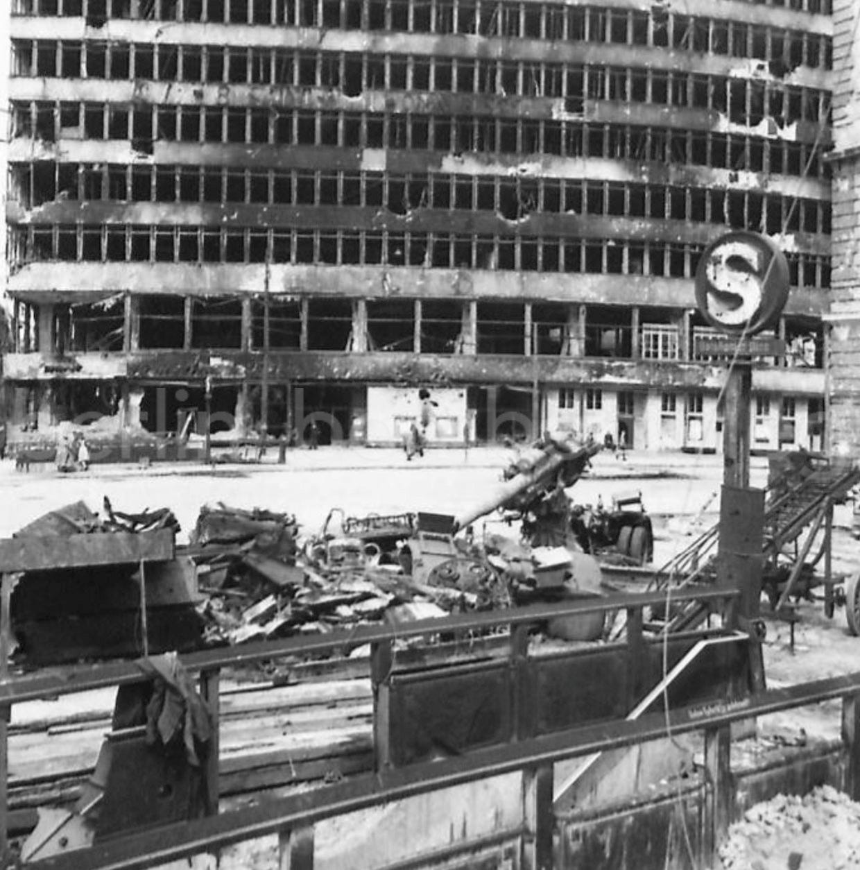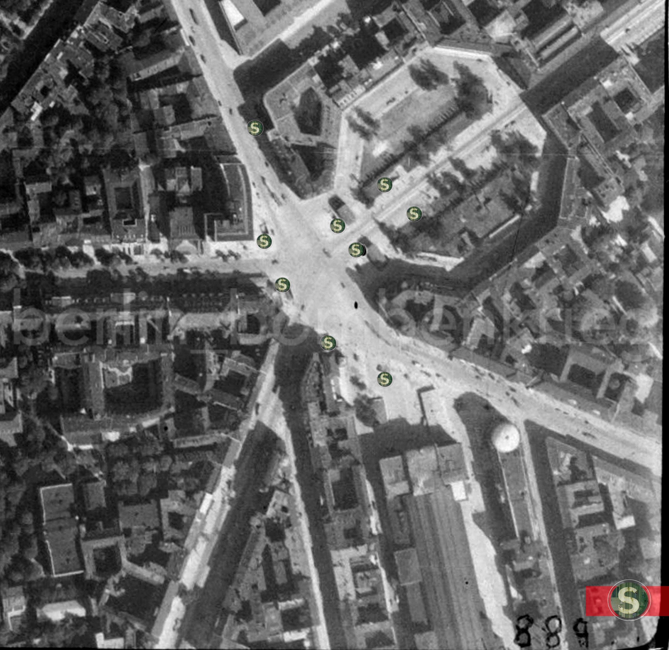 Close examination of all known pictures taken in the aftermath of the war reveals that of the nine original “S” signs placed at Potsdamer Platz, at least six of them survived the battle with more or less damage.