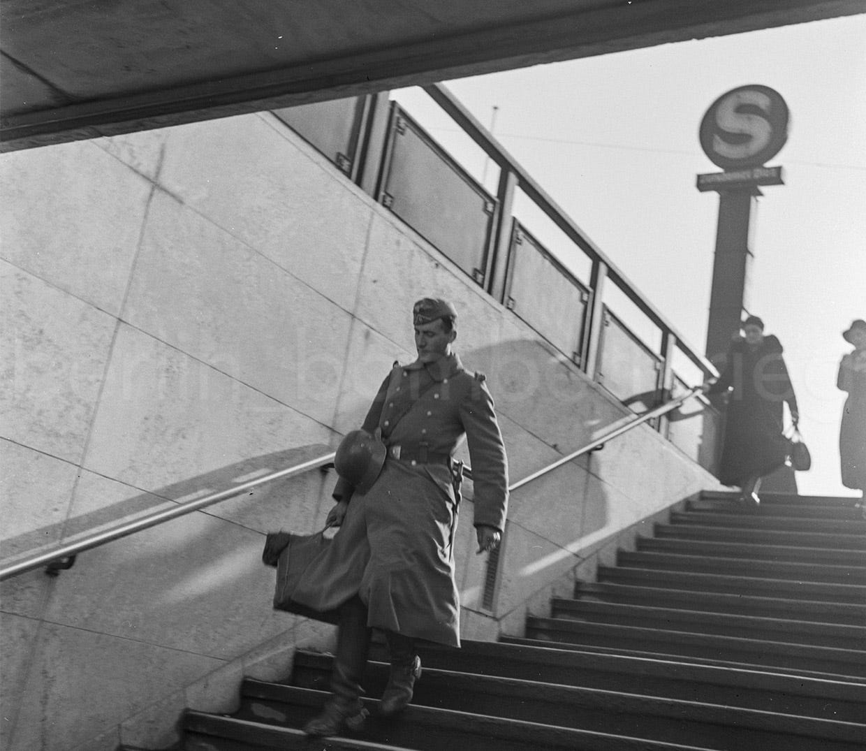 The North-South S-Bahn tunnel was built in 1934-36 (already planned by the Weimar Republic) and the Nazi government expanded it in 1936 with this second underground link that included Potsdamer Platz-Anhalter Bhf-Yorckstraße. It was opened in April 1939, a few months before the outbreak of the war. Each of the nine exits of the station was marked by an S-Bahn pylon, as other stations in this route. Following wartime blackout policies, in 1940 the city’s S-Bahn poles and exit stairs were marked with white paint as were curbs and street signs.