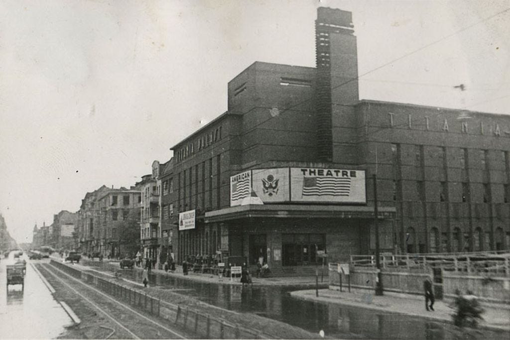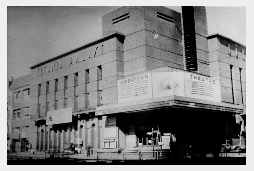 July 1945: two views of the Titania during the early days of the US occupation of the city. Notice an U.S. Army Willys jeep at far left on the first image and the big American star and stripes flags decoration on the “American theatre”.