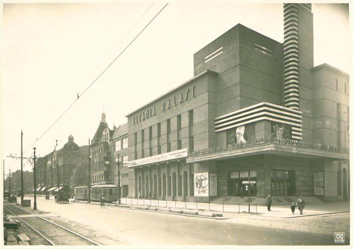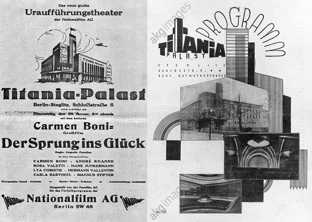 The Titania-Palast cinema-theatre was built in as a luxury 2,000 seater building designed by architects Ernst Schöffler, Carlo Schloenbach & Carl Jacobi in 1927 in the style of “Neuen Sachlichkeit” or New Objectivity Social realism. The big building was criticized by many contemporary observers and architecture experts due to its deliberately asymmetrical arrangement and entire facade parts are dummies without function. It had an organ, full stage facilities and a cafe room.
