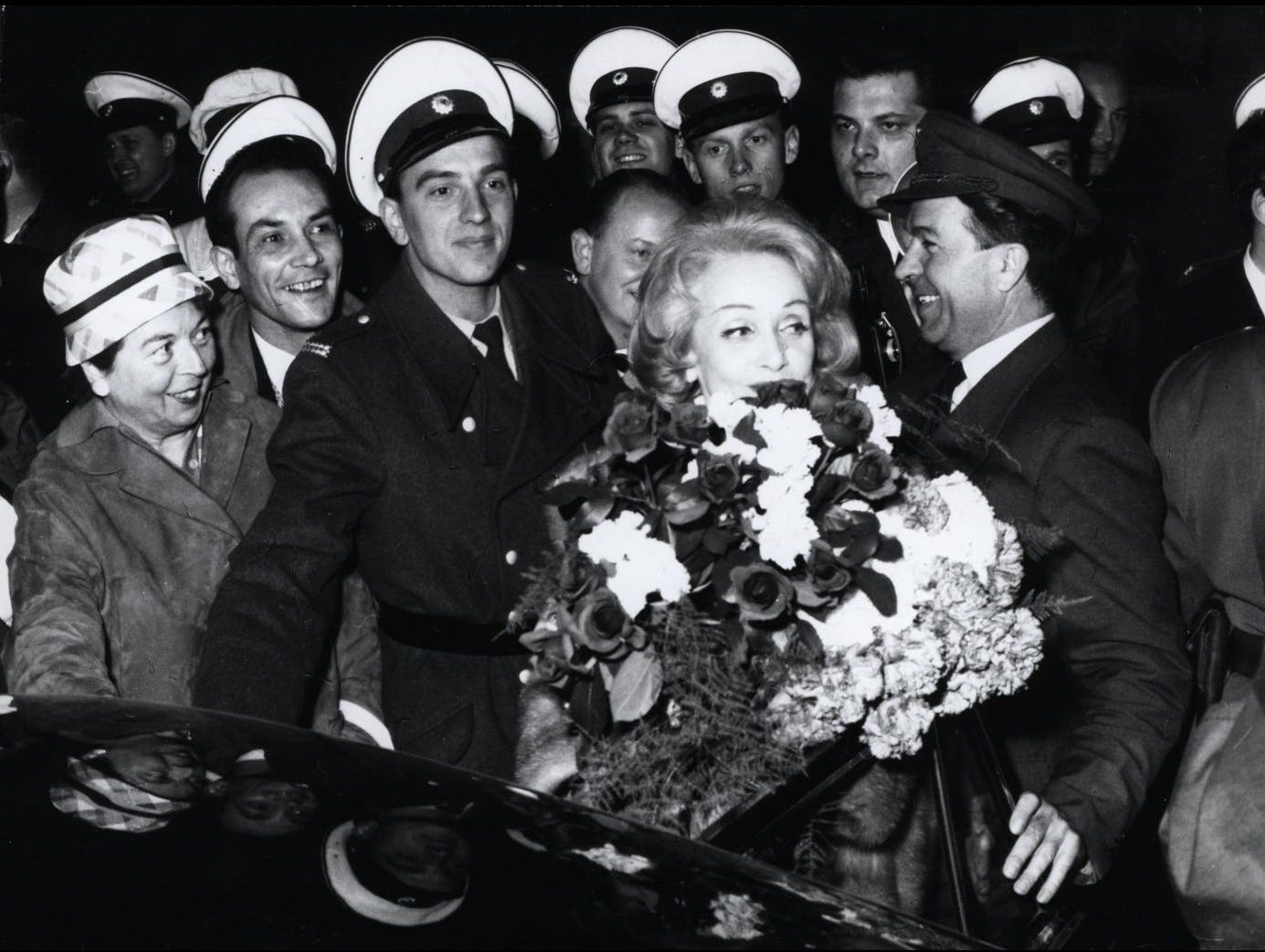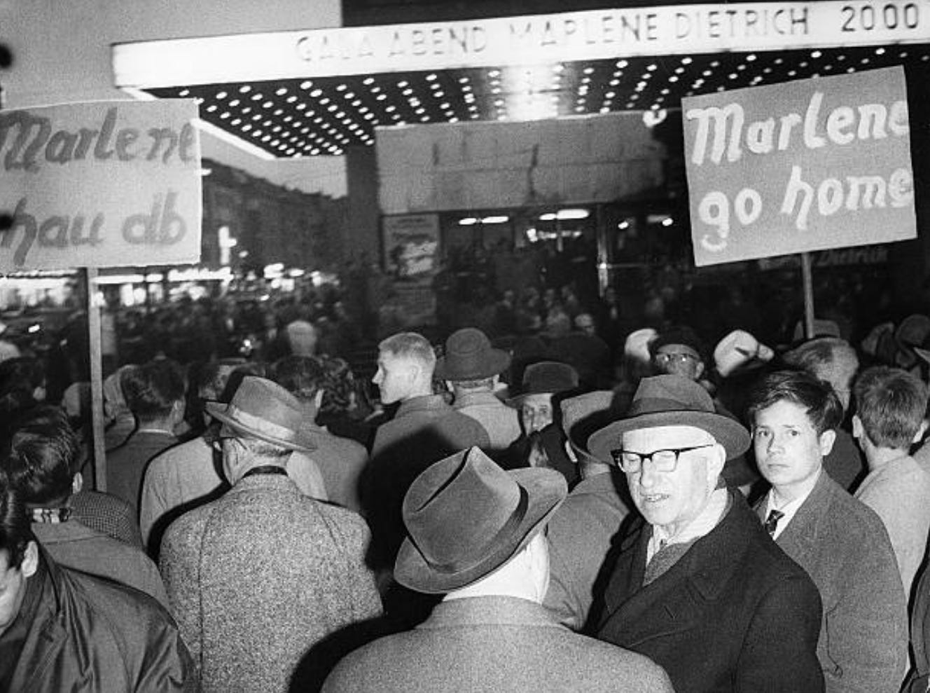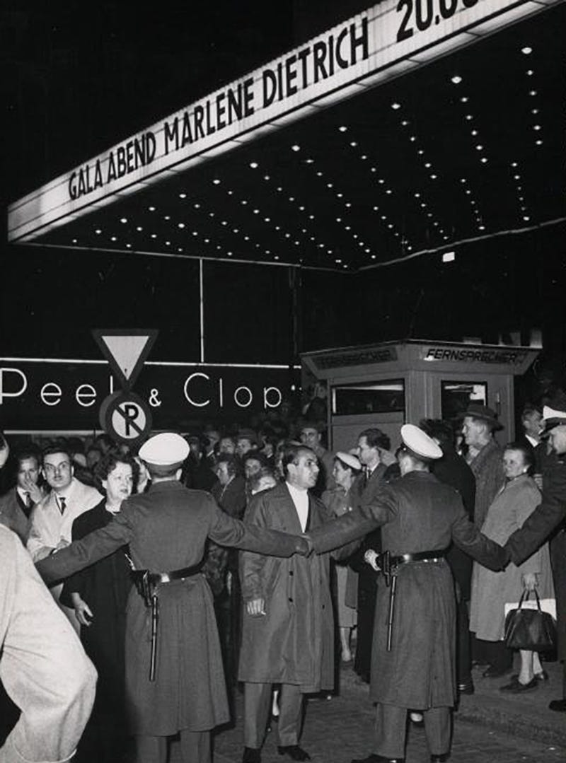 Among the famous stars who performed at the Titania-Palast in Berlin Steglitz in the postwar period was Berliner actress Marlene Dietrich (December 1901 Berlin-Schöneberg – May 1992). She visited the city as a prelude to her Germany tour performing live in large theatres and this performance at Berlin on 3 May 1960 was the first public appearance of the star in Germany after the Second World War. The tour was an artistic triumph, but a financial failure. Photographer Harry Croner (1902-1992) documented Dietrich’s visit to Berlin from her arrival at Tegel airport. Marlene’s performance at the theatre in 1960 drew adulation and glamour and she received a standing ovation during the performance but a concentration of protesters too, opposed to the famous actress and her tour of Germany, which they considered a “traitor” after leaving the country 30 years before. At least one hundred police had to protect the arrival and Dietrich’s departure at the Titania and finally she had to hide from the crowd in the car (see last picture). “The Germans and I no longer speak the same language” says the cabaret actress after the incident; she would never return to the city.