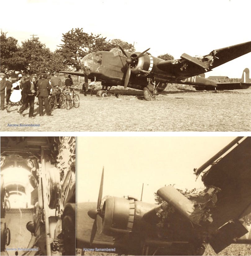 [One of the six Hampden medium bombers lost on the night of 25/26 August 1940 during the first bombing of Berlin by the British RAF was P2070 VN-X from No 50 Squadron, seen here after forced landing on the return leg. All four crew-members, led by P/O Rober D Wawn (Australian) were captured and sent to various POWs camps, surviving the war.]