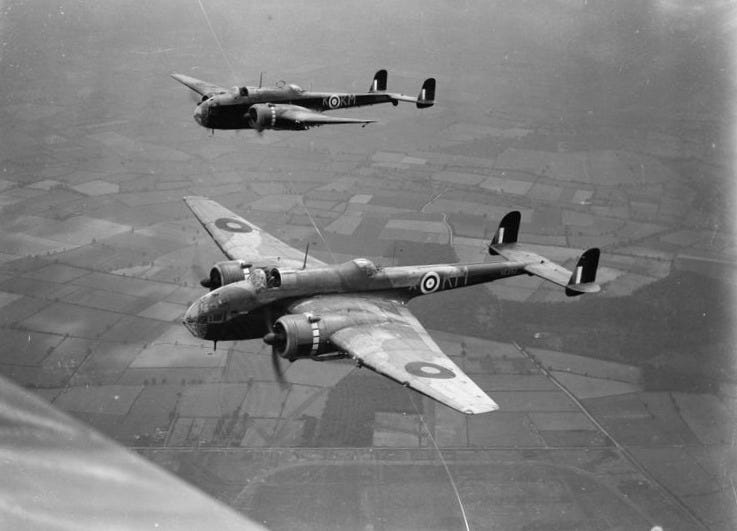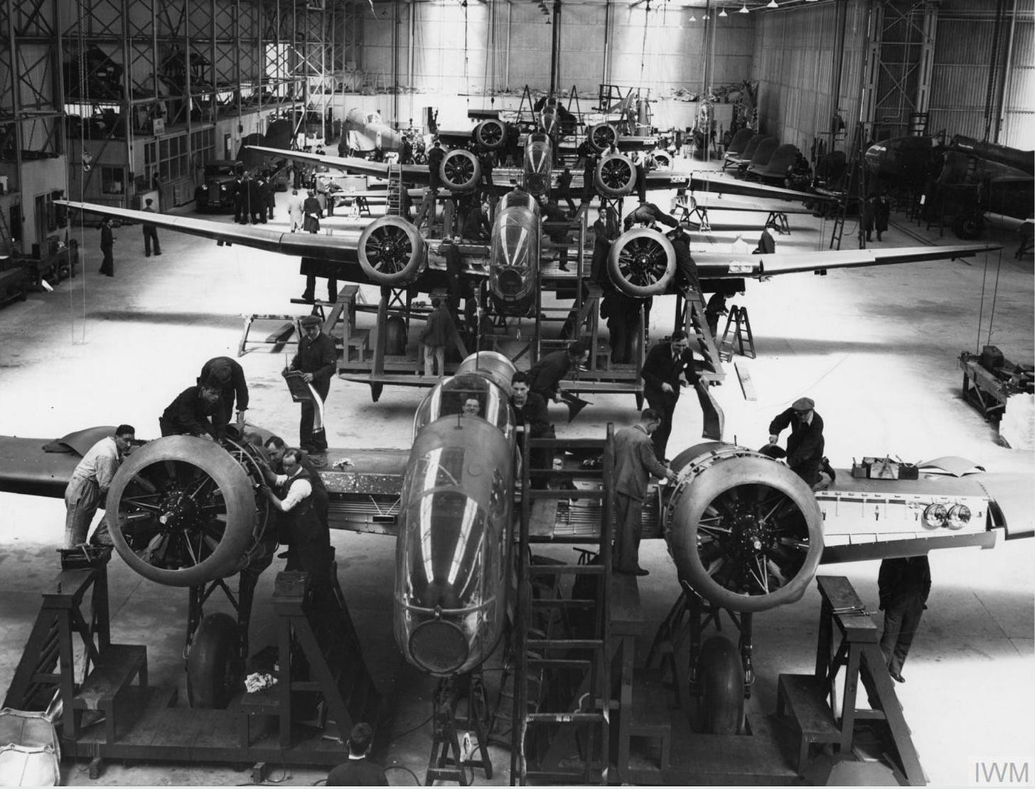 [British HP.52 twin-engined bombers near completion in the assembly line at Handley Page’s plant at Radlett, Hertfordshire during the first year of the Second World War. Handley Page would go on to manufacture nearly 500 of them and English Electric a total of 770 Hampdens, built under subcontract between 1939 and 1942].