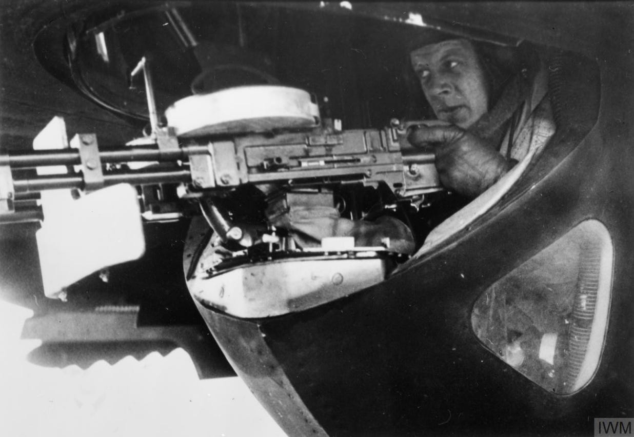 [The ventral rear gunner’s position in a Handley Hampden of No 106 Sq RAF at Coningsby, Lincolnshire, viewed from the starboard side. Operating the twin .303 Browning machine guns is Flight Lieutenant Chisholm, the Squadron Gunnery Officer.]
