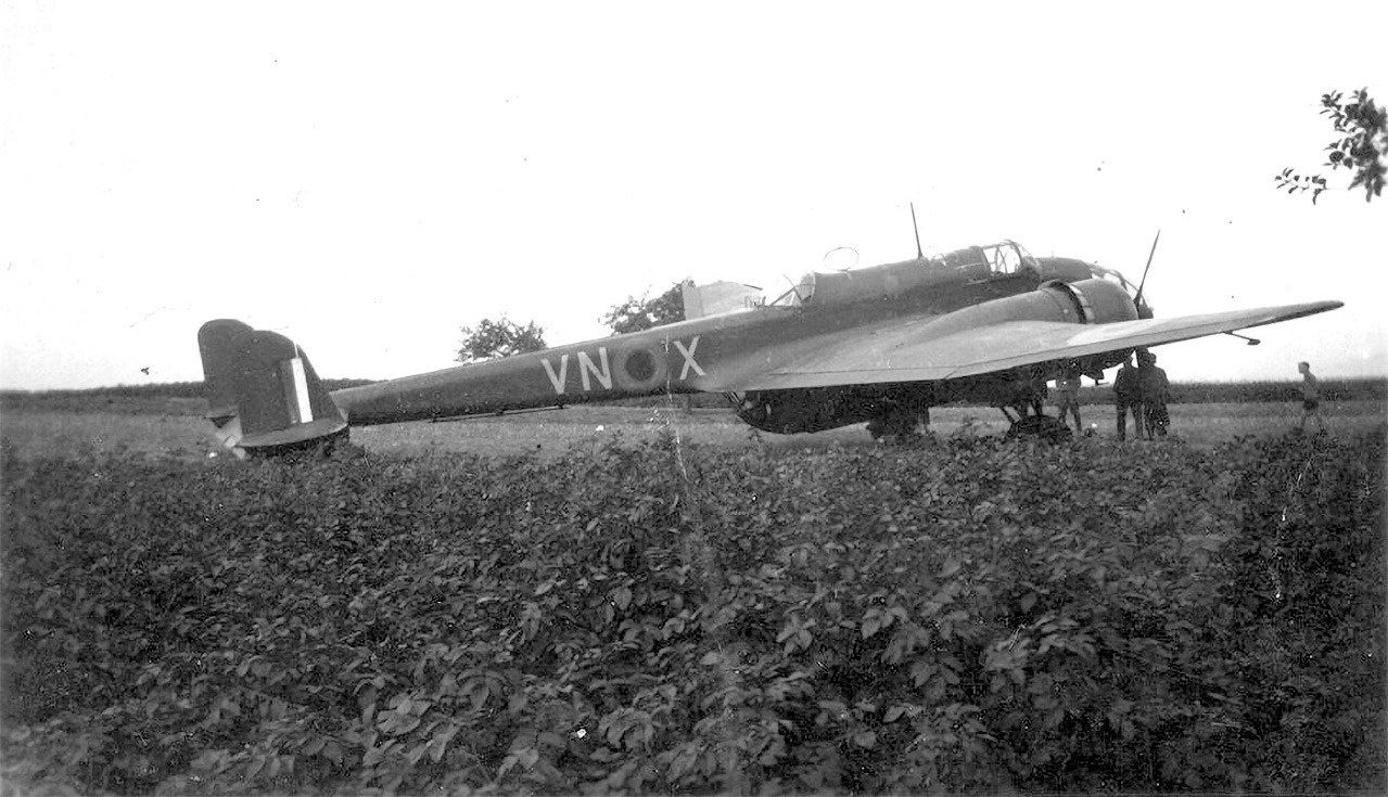 [A recently published picture of Hampden P2070 (P/O Wawn crew) VN-X of RAF 50 Squadron which ran out of fuel after being hit by Flak on the return flight on August 26th and force-landed near Lautersheim in Rheinland-Platz. They were the first aircrew to go into captivity whilst engaged on a bombing raid to Berlin.]