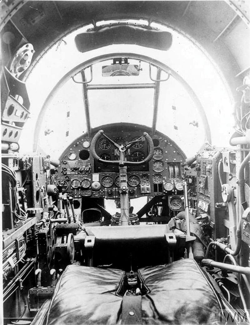 [The instrument panel and flying controls of an RAF Handley Page Hampden, showing the almost impossible task of getting into the nose compartment. The bomber’s fuselage was only three feet wide, similar to a single engined fighter at the time, so the pilot was more or less stuck on his seat for the entire flight, sometimes up to 9 hours. Note the rear view mirror top of the front plexiglas panel.]
