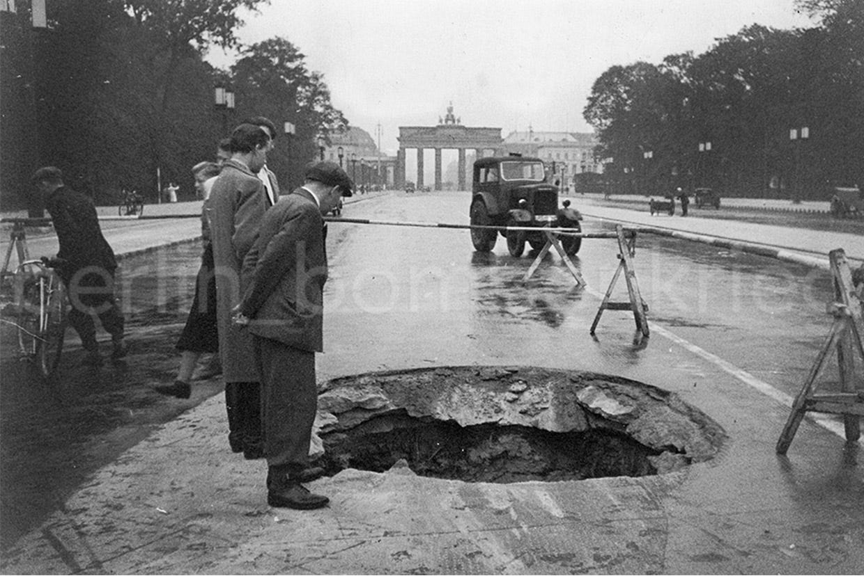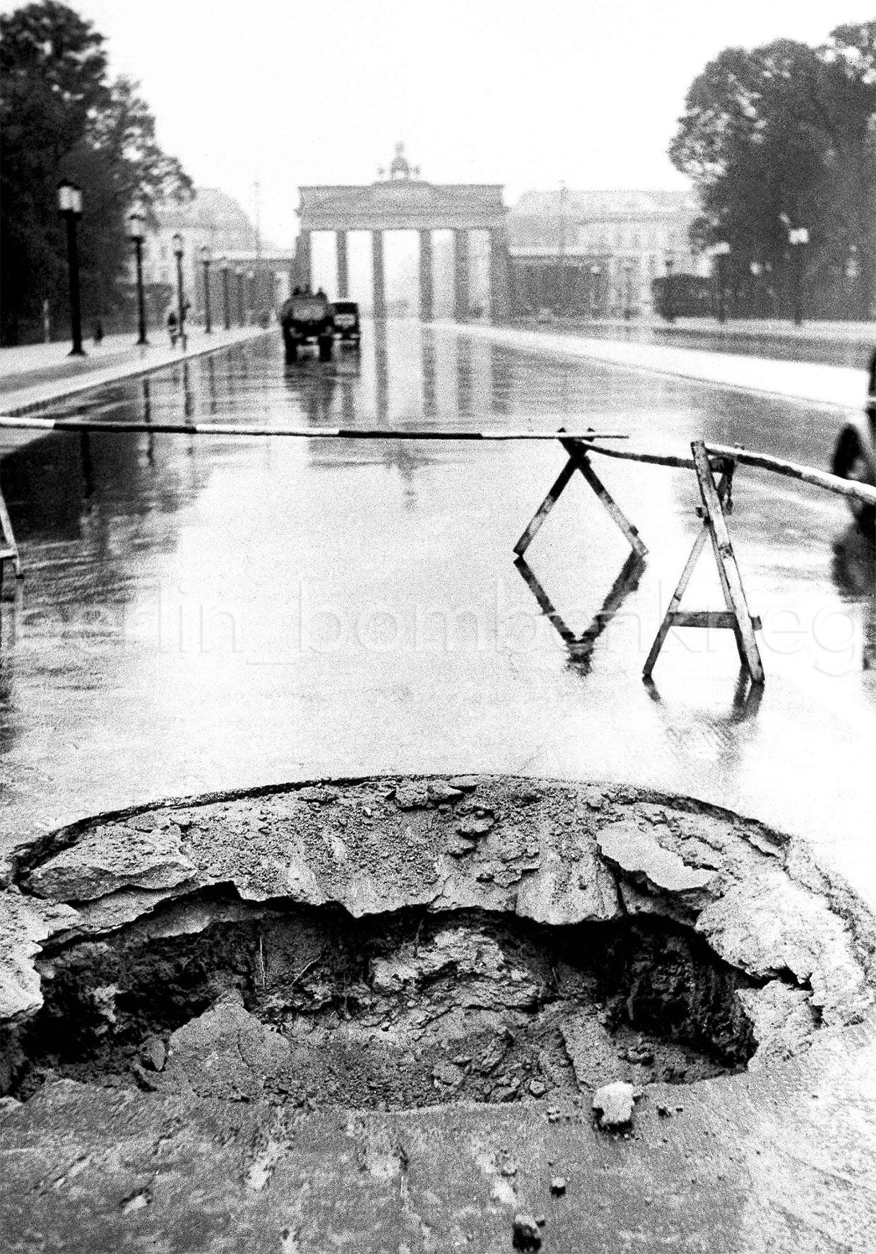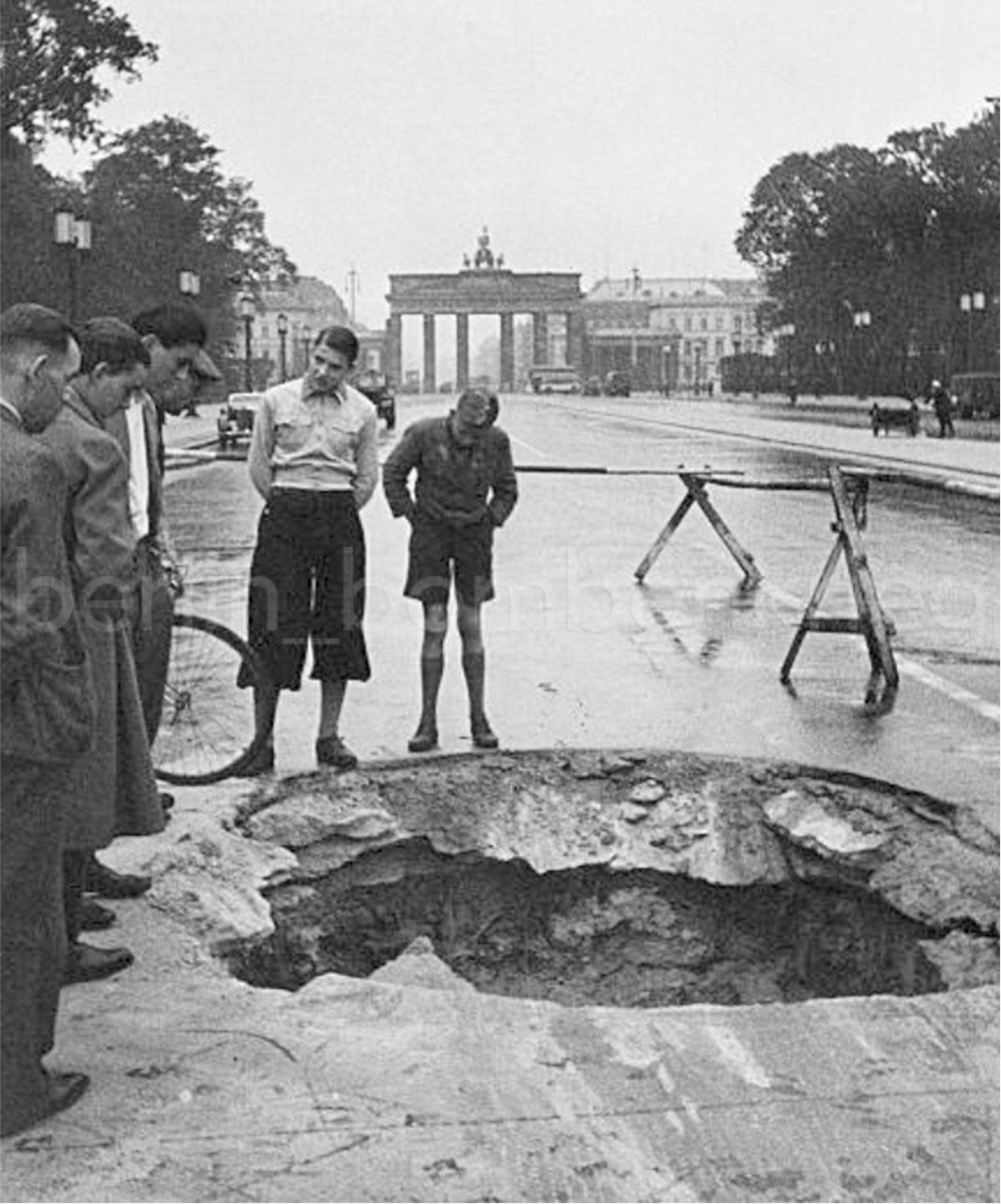 But without no doubt the image that caught most people attention was the one shot by a German photographer hours after the raid. Taken at Charlottenburger Chaussee, then part of the Nazi triumphal avenue Ost-West-Achse (today’s Straße des 17. Juni) a few metres from the famous Brandenburg Gate and surrounded by Tiergarten woods, Berliners take a look curious and amazed into the crater caused by a high explosive bomb dropped by the RAF.