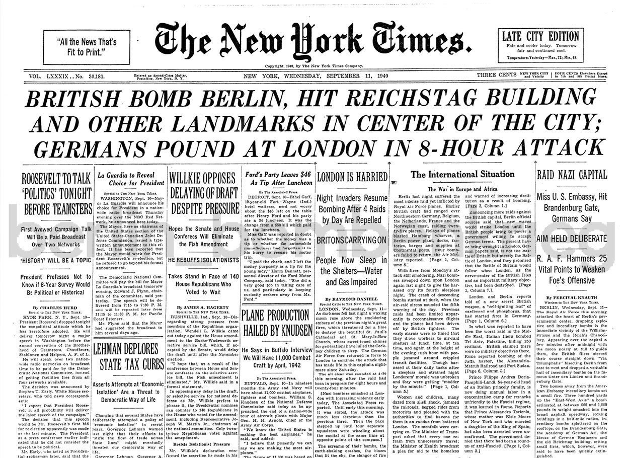 “CENTER OF BERLIN POUNDED BY R.A.F.” The New York Times, Wednesday, September 11, 1940, page 4