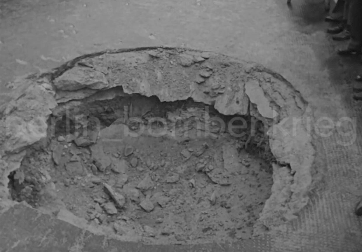 “Three hundred yards up the “East-West Axis” a bomb estimated at between 500 and 1,000 pounds in weight (sic) smashed into the broad asphalt speedway, rocking buildings in a half-mile radius” reads the original text from the American correspondent in Berlin Percival Knauth which witnessed the raid’s aftermath in the German capital.9