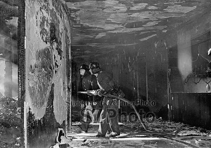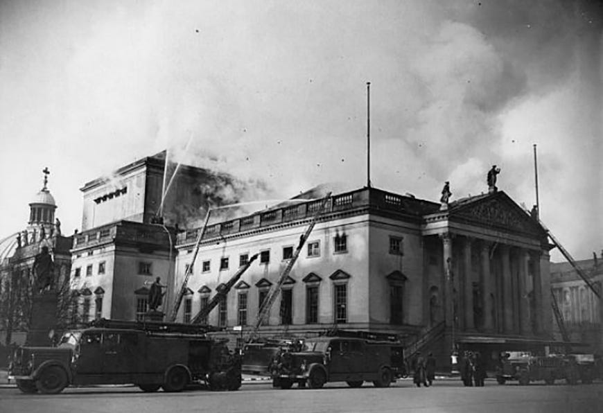 According to the city’s municipal report, “she was hit by a large number of incendiary bombs. Burned out theatre building, stage house badly affected. Heavy property damage.” Heinrich Hoffman, Hitler’s official photographer, was there and took a series of dramatic photographies of the Opera engulfed in flames after the attack.