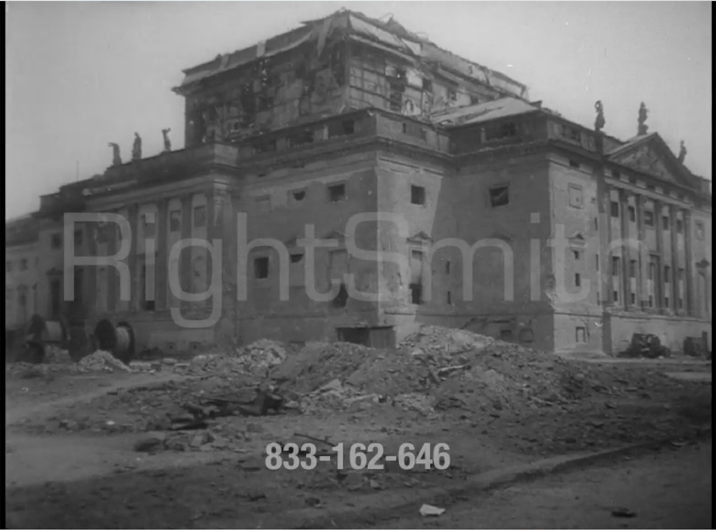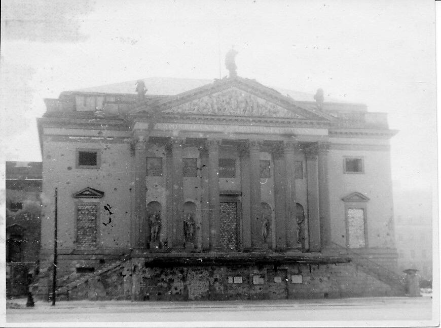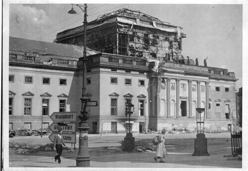 The rebuilt Opera house had just 26 months when the building was finally destroyed on February 3, 1945 hit again by bombs during the massive daylight raid made by US Eighth Air Force. That Saturday the government district of Berlin was pounded and smashed to rubble by American bombs dropped by 937 four-engined bombers which unloaded 2,500 tons of bombs. The Americans lost 23 bombers. Some bombs fell on Unter den Linden and three of them hit the theatre, engulfing in flames not just the roof and the auditorium but also the foundation walls. The portico and the Apollo hall including the internals of the years 1941/42 remained more or less intact.