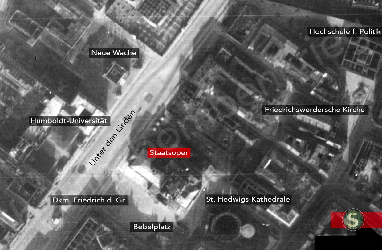 That last great bombing, and the subsequent Battle of Berlin with its bloodied street fighting with Soviet troops left the centre of the capital in a dilapidated and ruined state, with the bad damaged Staatsoper being finally taken by Red Army’s 416th and 295th Rifle Divisions after heavy fighting block by block moving west along Unter den Linden on May 1st, 1945, with the iconic Opera building included in the destroyed set of war prizes get by Stalin as conqueror and final executor of the Third Reich.