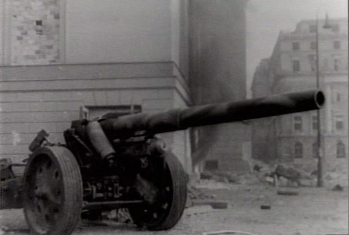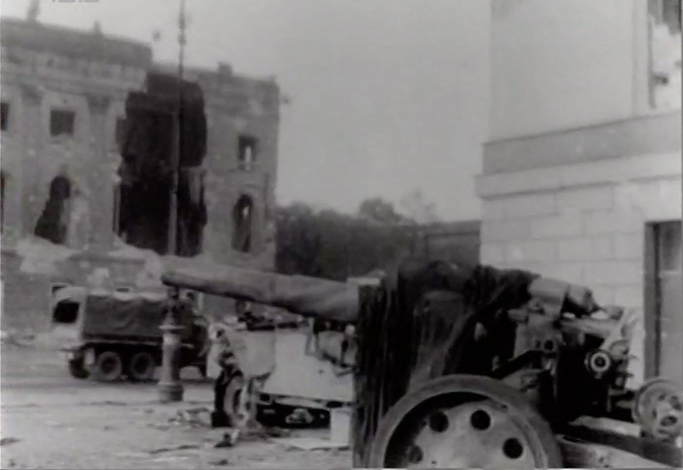 Two views of a German 15 cm FH18 howitzer gun at Bebelplatz next to the Staatsoper, left behind by the defeated garrison after the battle with the Red Army.
