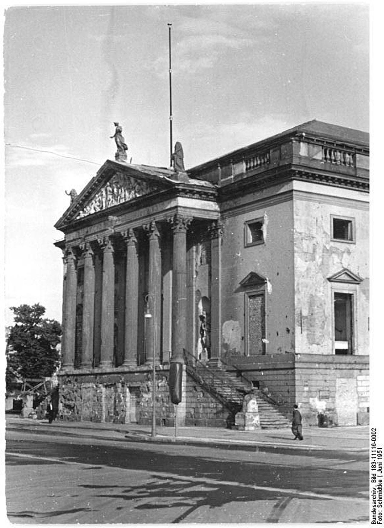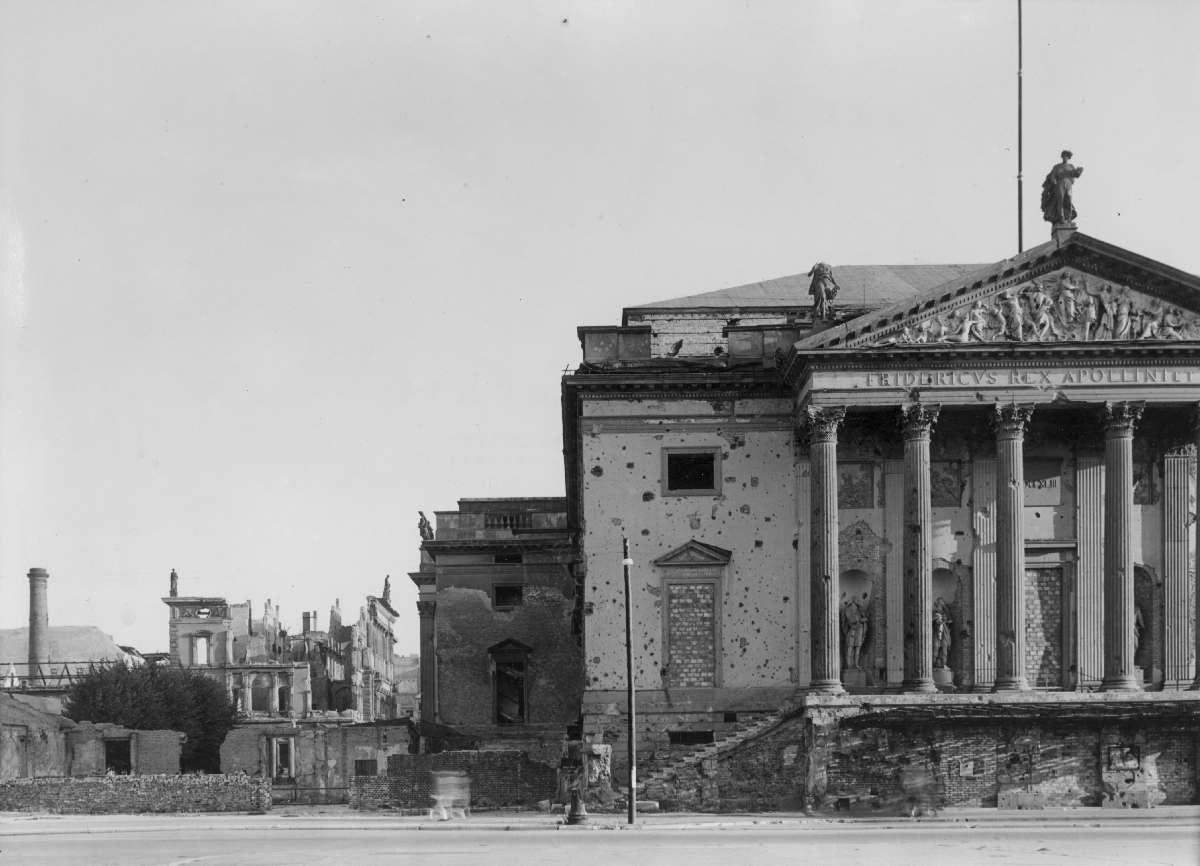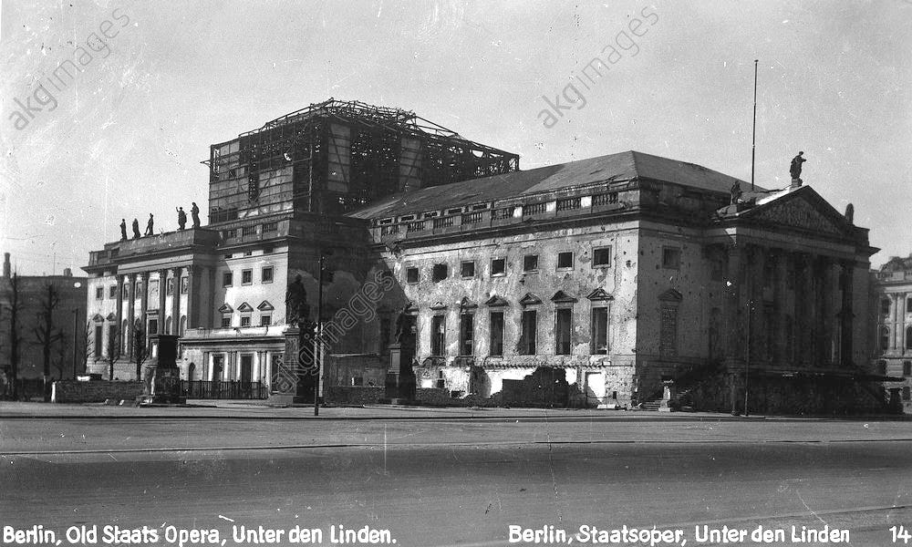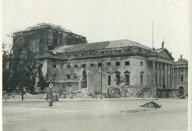 The Oper den Linden theatre as seen just prior to the start of the restoration in June 1951, the destruction caused by the air bombing raids and the war is evident.