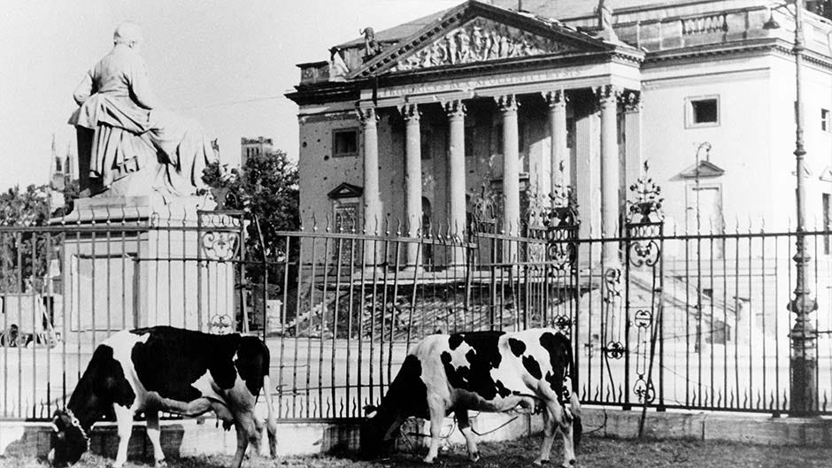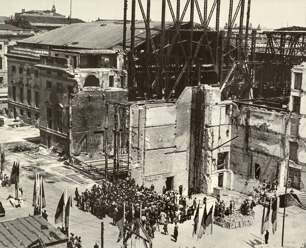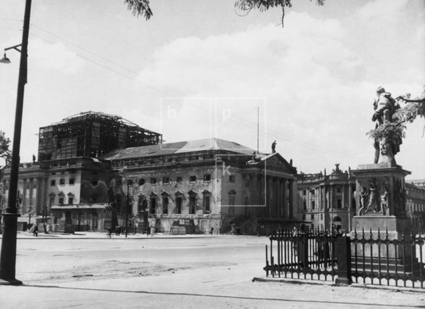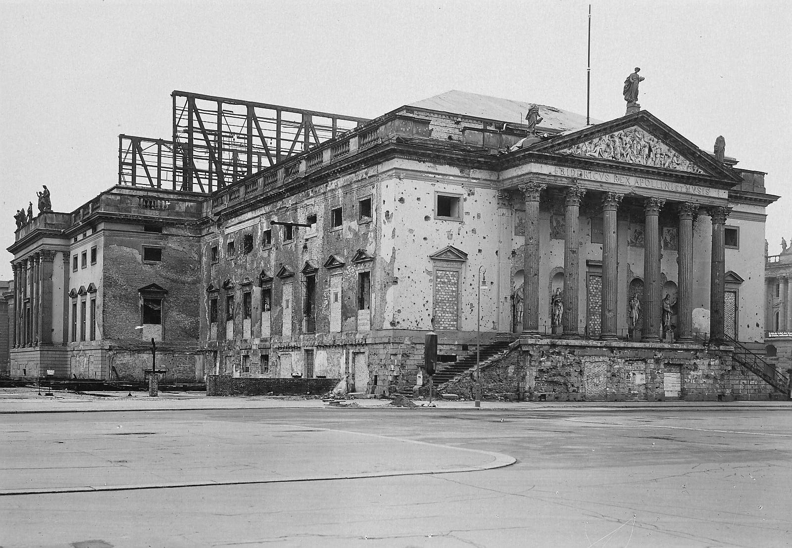 The Oper den Linden theatre as seen just prior to the start of the restoration in June 1951, the destruction caused by the air bombing raids and the war is evident.