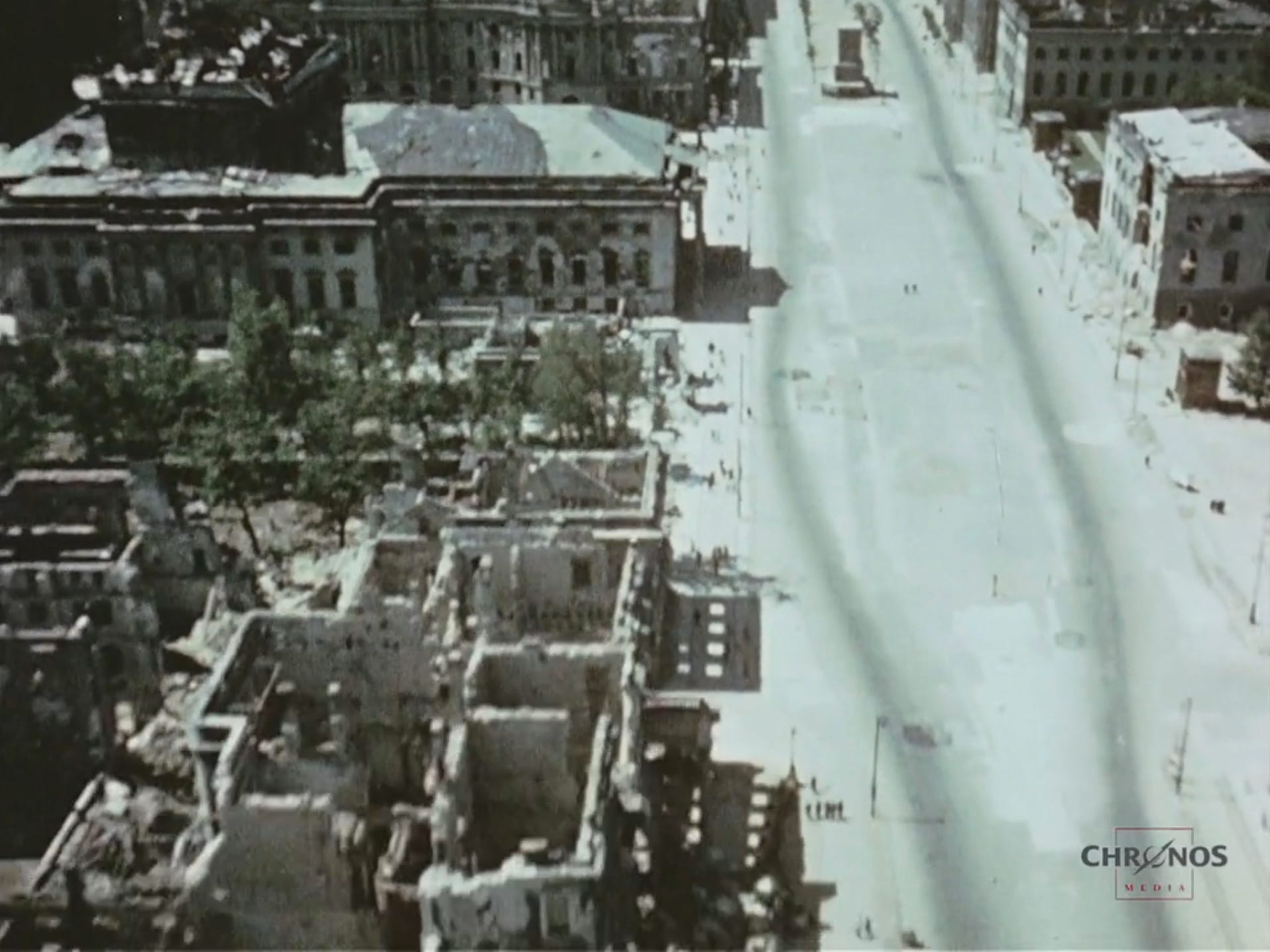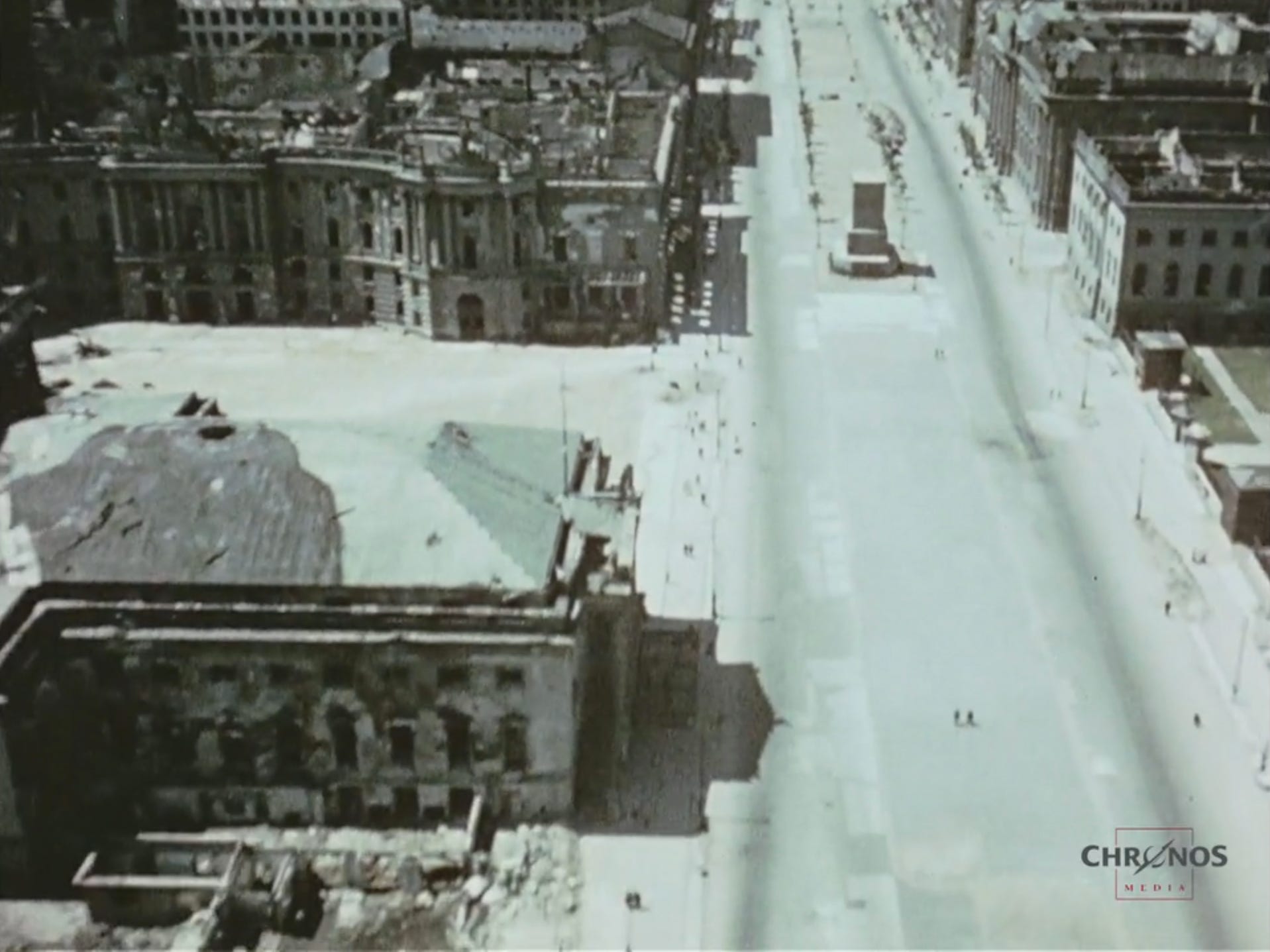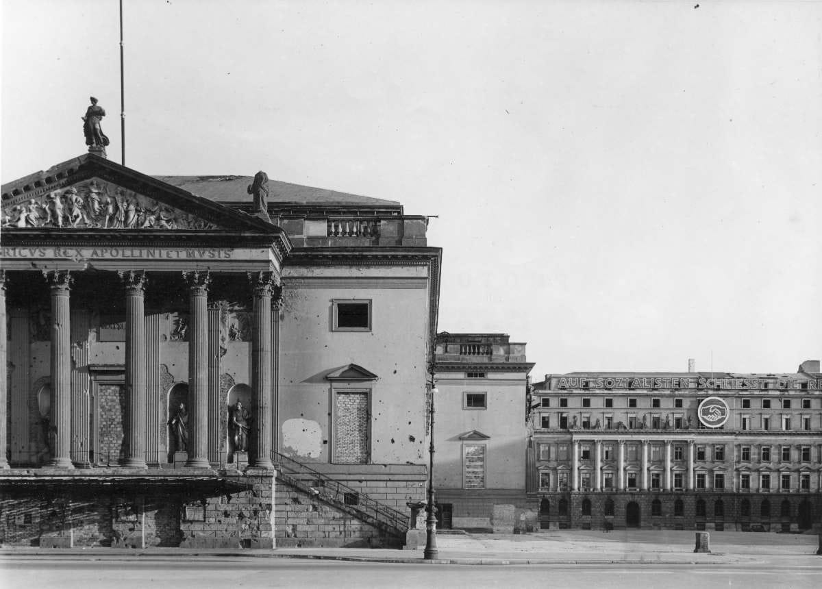 Year 1949: Destroyed north facade and eastern and western stage house of the Staatsoper after the Allied air bombing and Soviet assault. Notice shrapnel heavy damage on walls and at right the DDR East Germany slogan reading “Auf Sozialisten schließt die Reihen”, taken from the Sozialistenmarsch, a song written in 1892 for the Sozialdemokratische Partei Deutschlands (SPD).