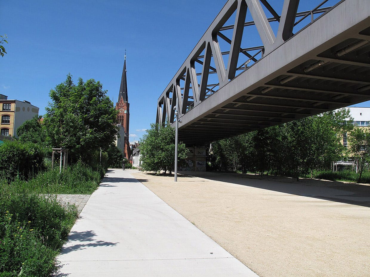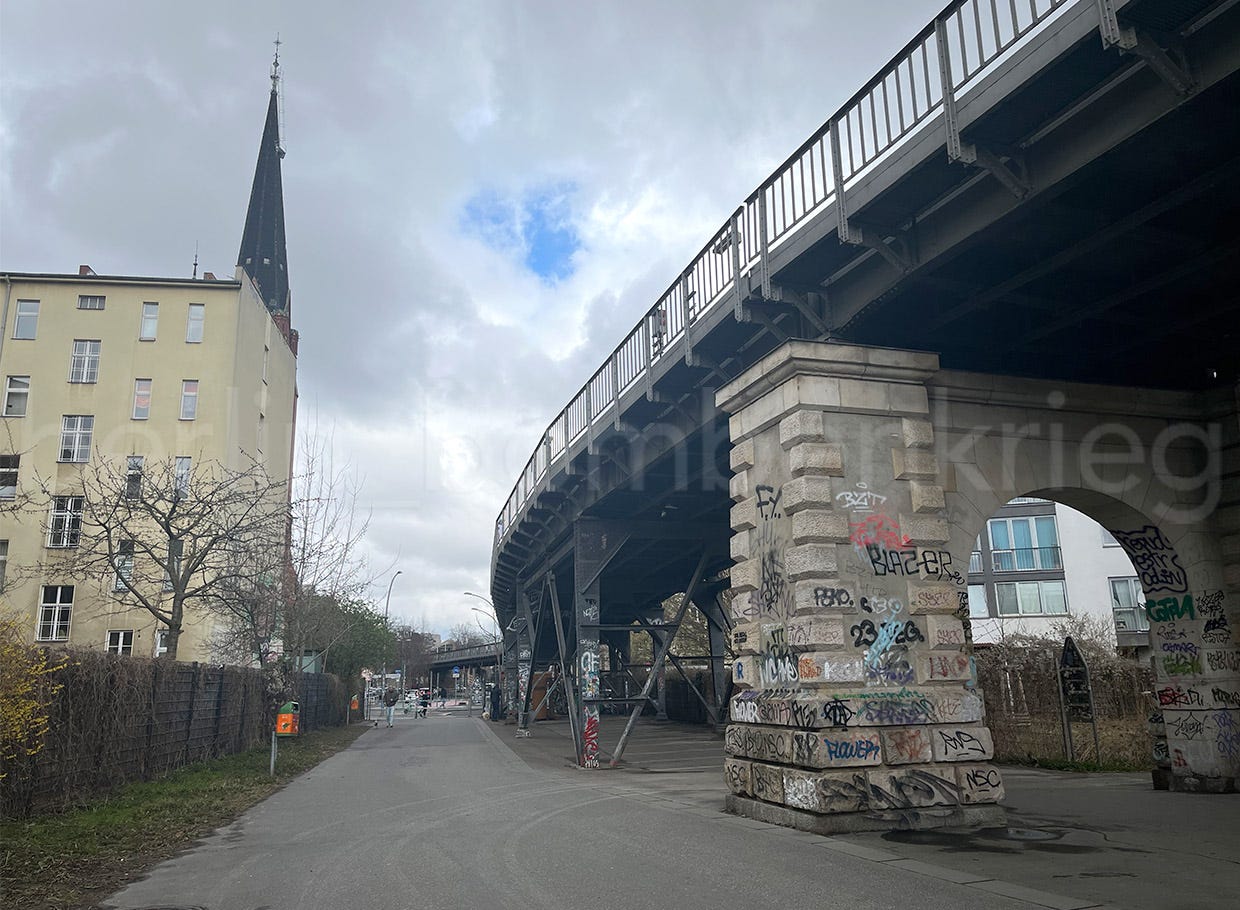 Today, the elevated railway line runs westwards undisturbed towards Bülowstraße, through Gleisdreieck’s Westpark (opened in 2011-14), one of the three public green areas of the Park am Gleisdreieck, an approx 31.5-hectare park located on the wasteland of the former Anhalter and Potsdam Güterbahnhof at Gleisdreieck and stretches from the Landwehr Canal across Yorckstraße to the east.