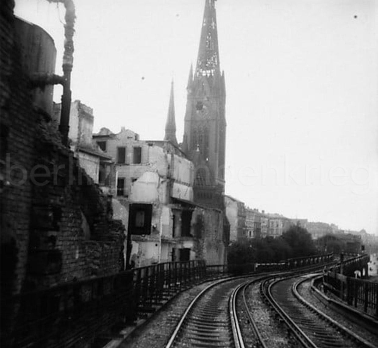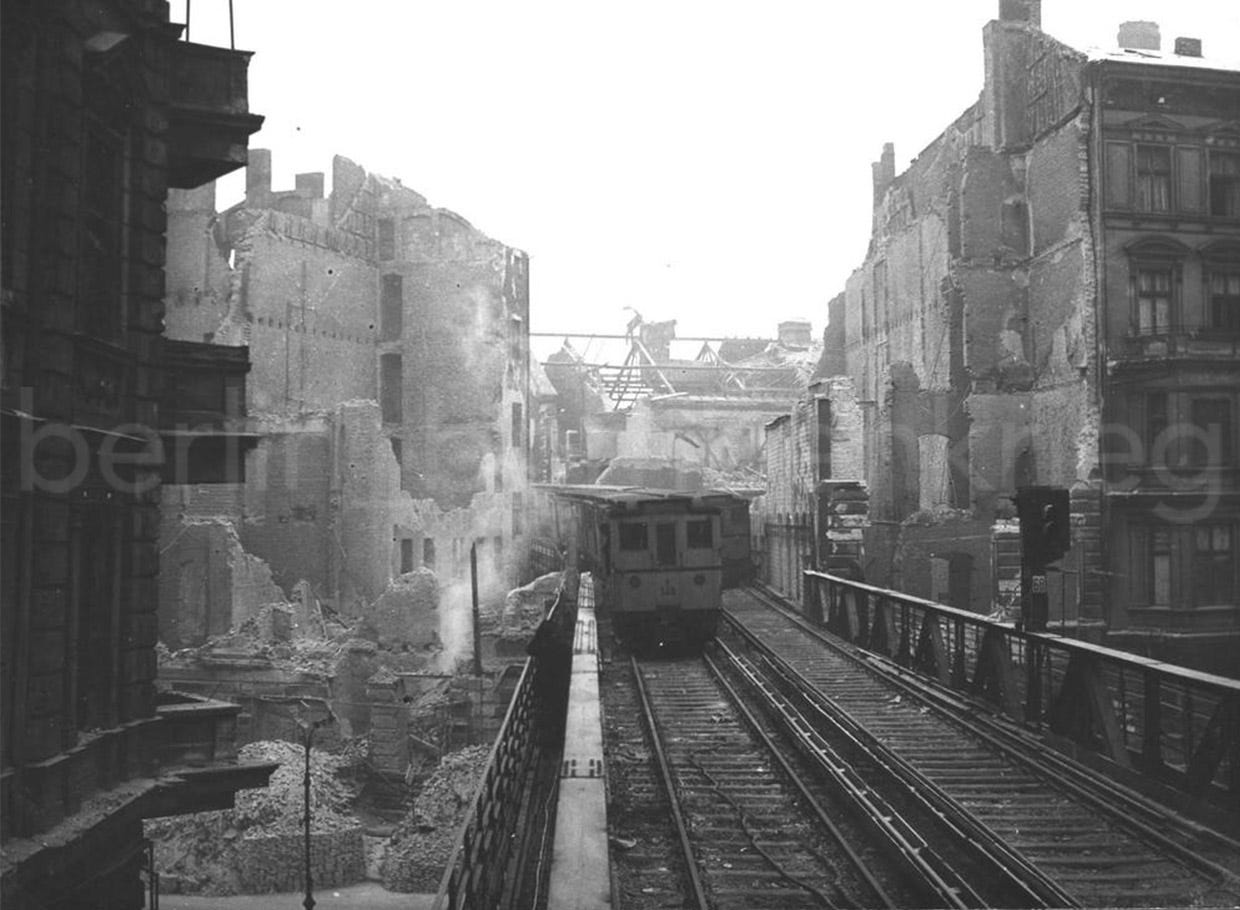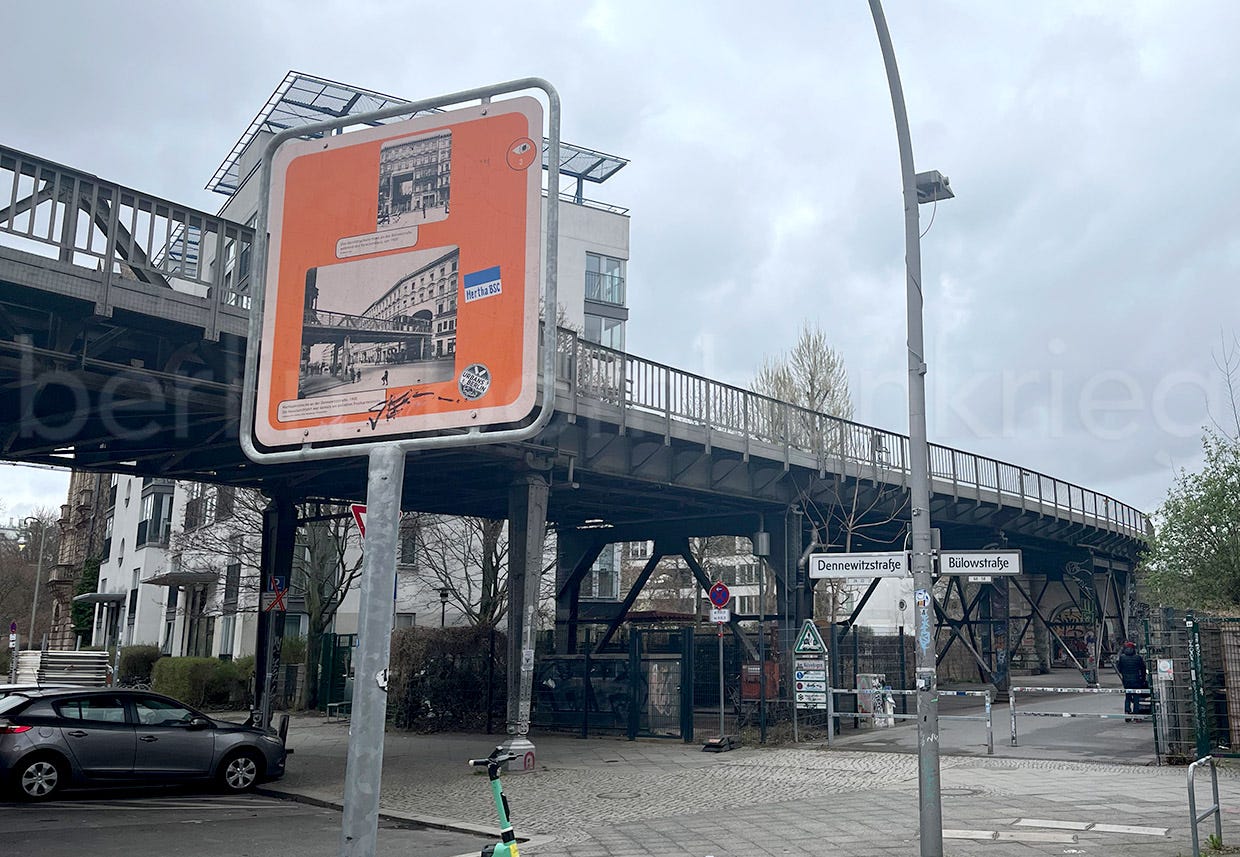 Further notable damage was received in early 1945 there, when on 24/25 February a British nuisance raid hit the elevated railway at Bülowstr. 97 with aerial mines (already hit on July 1944), and also in March 1945, when RAF Mosquitoes raided all area and left heavily damaged the adjacent streets and the Bülowstraße railway bridges.